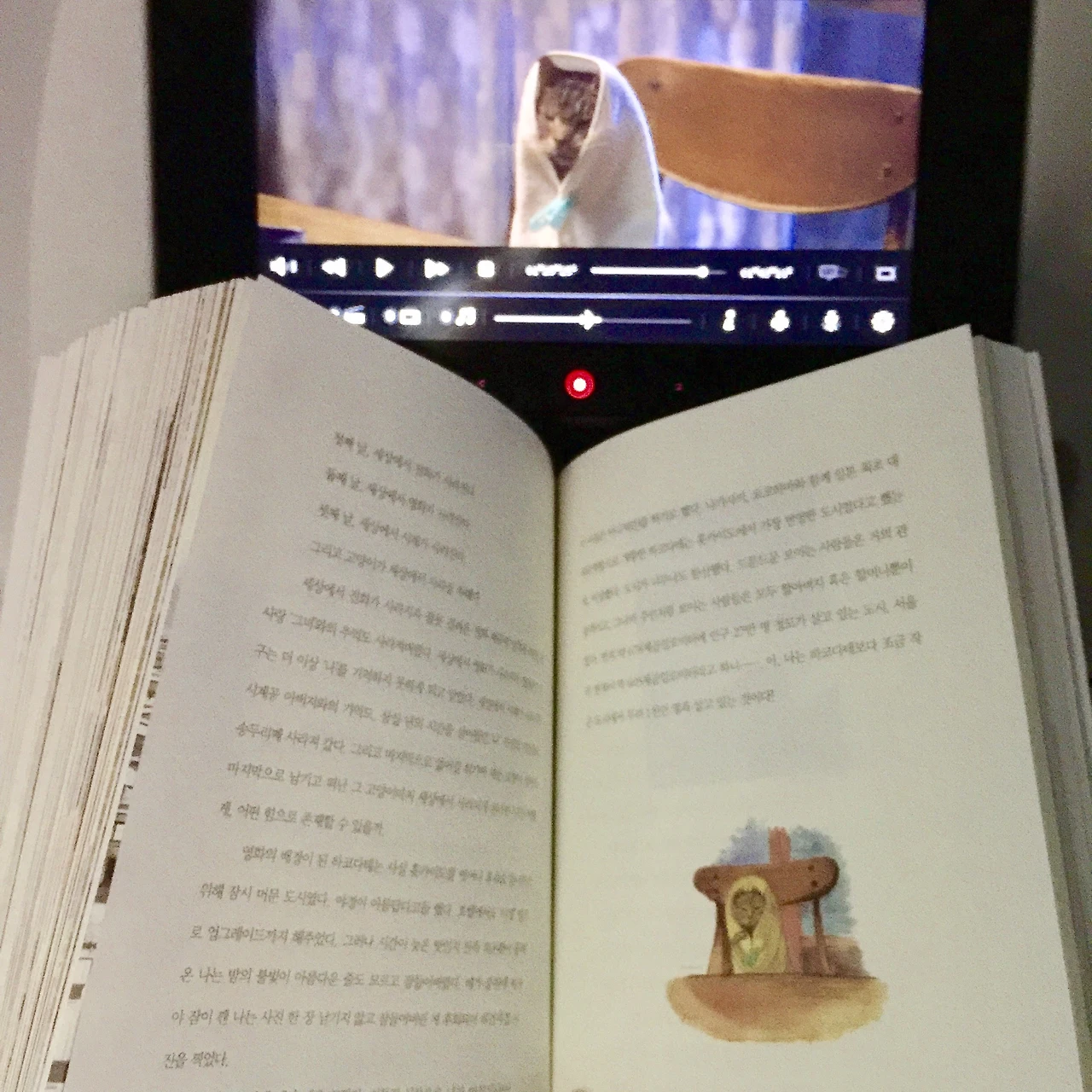 다 쓴 칫솔에 흰색 유성 물감을 잔뜩 묻혀서 흩뿌린 눈이었다. 내 생애 오타루에서 만큼 많은 눈을 맞았던 적이 없으니까. 눈은 충분히 뿌려야지. 복도를 사이에 두고 건너편에 앉아 있는 아빠 손에 든 <다정한 여행의 배경>의 표지는 그 밤들을 떠올리게 했다. 신나게 칫솔을 튕겼던 밤, 가스 등불이 두터운 눈 위에 내려앉아있던 오타루의 밤. 쿡쿡 웃음이 났다.