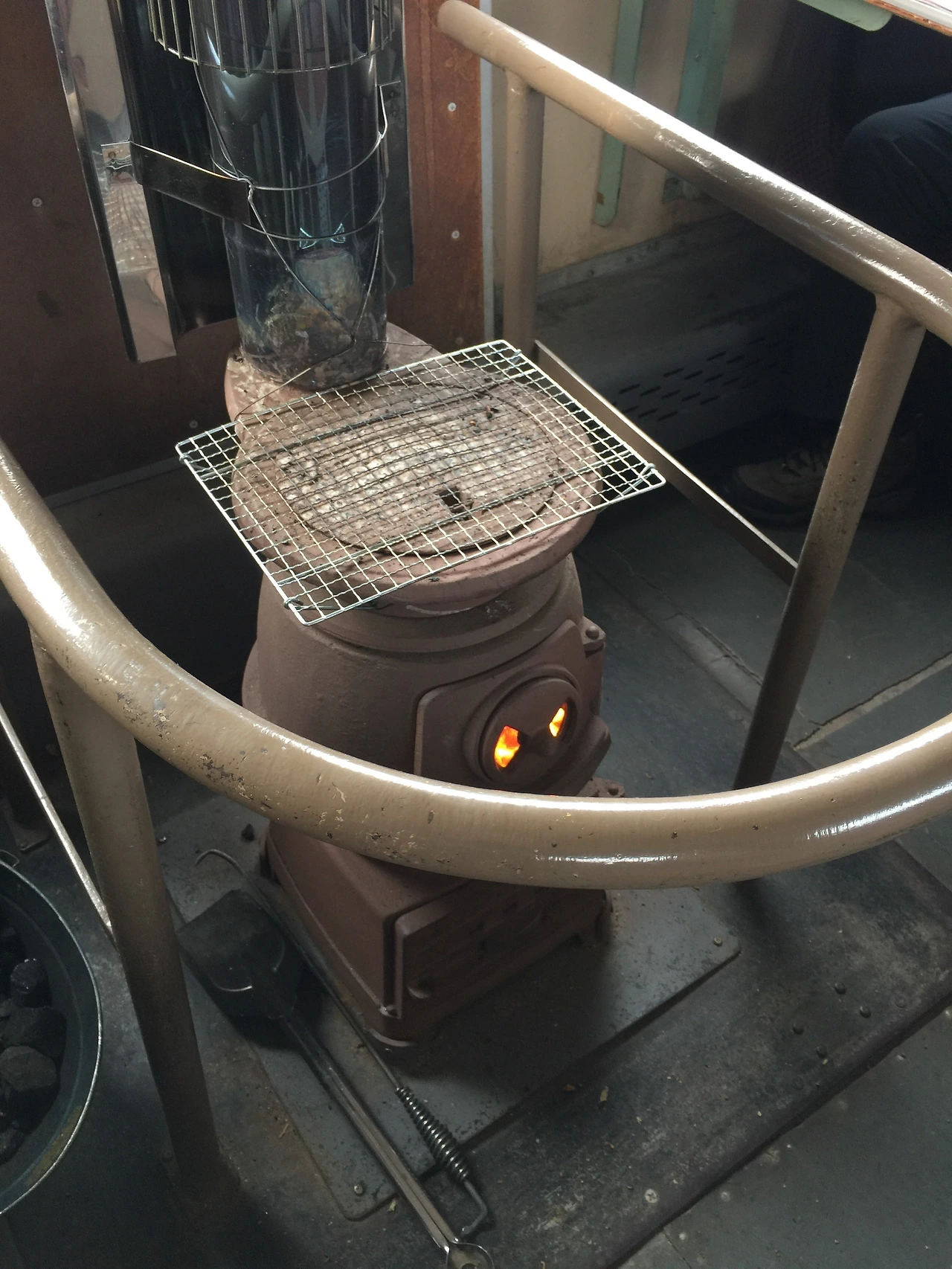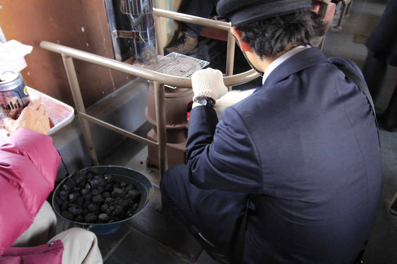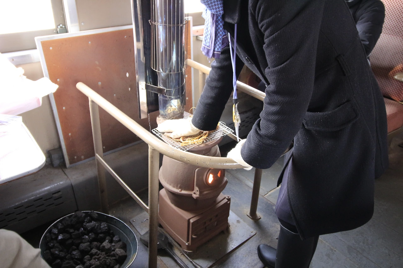 스토브 바로 옆은 이미 할머니 한 분과 할아버지 두 분의 여행 조합에 의해 선점되어 있었다. 스토브가 있는 열차에서는 유니폼을 입은 안내원이 가는 여정 내내 함께했다. 오징어를 주문하면 오징어를 구워주고, 이야기 상대가 되어주었다. 다자이 오사무도 안내원과 수다를 떨며 집으로 향했을까?