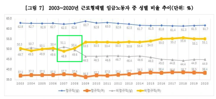 민주노동연구원 이슈페이퍼에 따르면 2007년 서브프라임 모기지 사태로 인한 경제 위기 이후 남성 정규직 비율은 증가하고 비정규직 비율은 감소하는 반면, 여성 정규직 비율은 감소하고 비정규직 비율은 증가하는 것으로 나타납니다.
