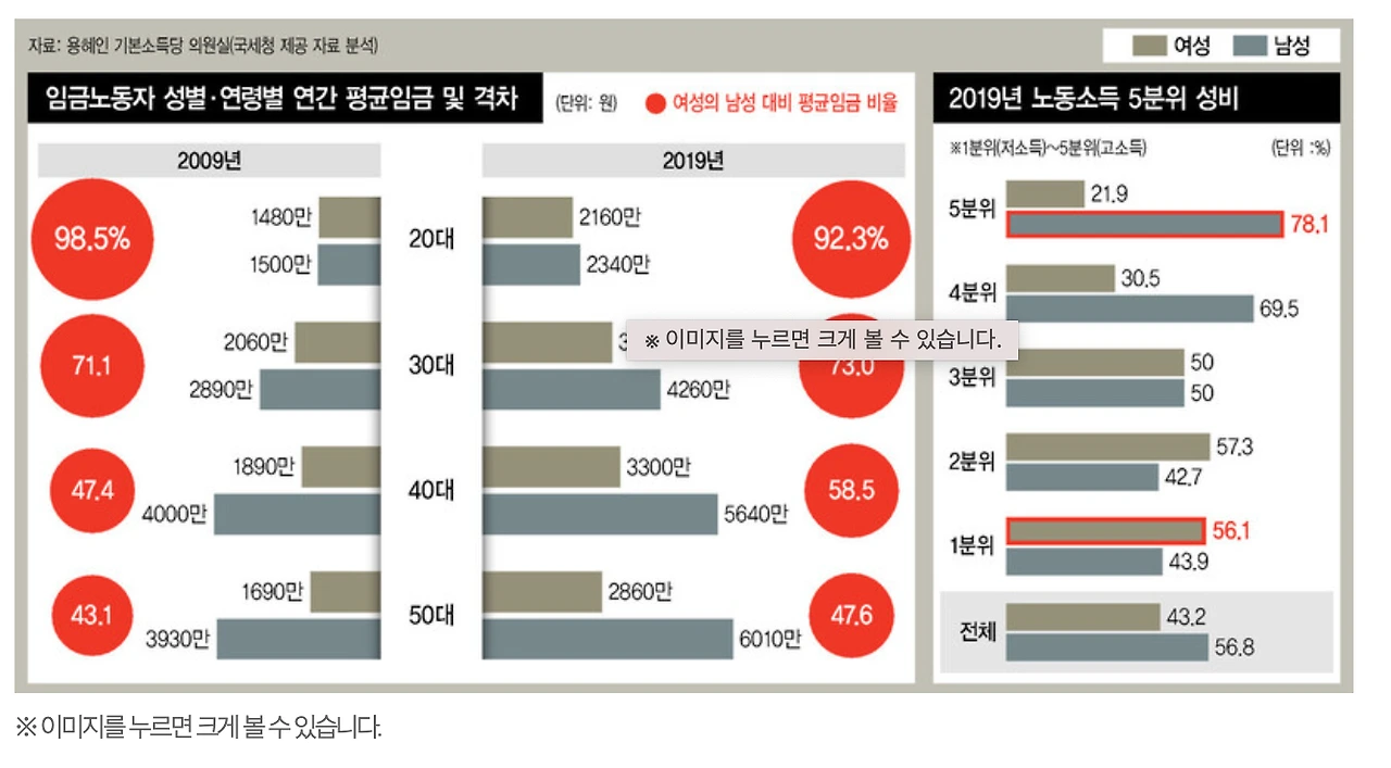 2019년 국세청에서 제공한 근로소득 통계를 기준으로 봤을 때 남녀 임금이 엇비슷한 20대와 달리 30대에선 남성 대비 70% 수준을 보인 후, 40대 이후부터는 58.5% 이하로 격차가 크게 벌어지는 점을 확인할 수 있는데요.