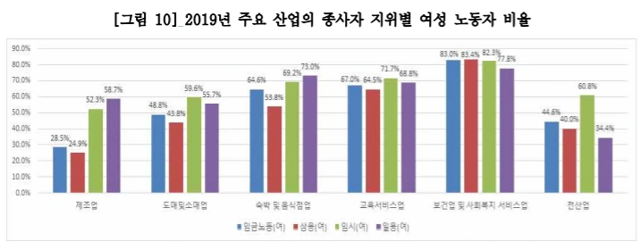그나마 보건업에서 취업자 증가하긴 했지만, 증가한 노동자 중 임시/일용직 비율이 56.1% 차지해서 여전히 여성의 고용은 불안한 것으로 해석해볼 수 있습니다.