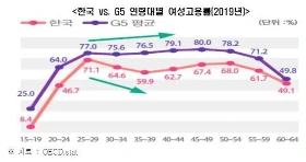 반면 G5의 여성 고용률은 20~40대까지 증가 추세를 보이다가 50대 들어 감소하며 거꾸로 된 U자 포물선(∩)을 그리는 것과 차이가 있습니다.
