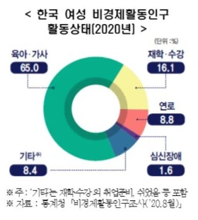 실제로 2020년 8월에 진행된 통계청의 비경제활동인구조사에 따르면 이러한 경력단절의 이유로는 육아/가사 부담이 65%를 차지해요.
