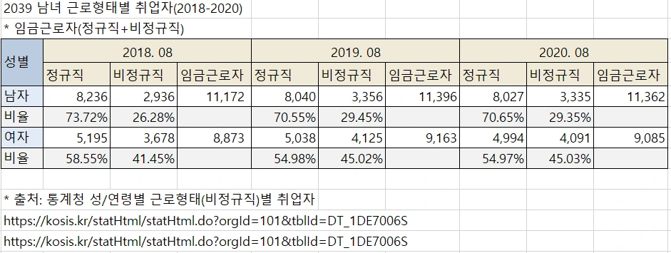 남성의 정규직 비율은 2018년 73.72%, 2019년 70.55%, 2020년 70.65%로 꾸준히 70% 이상을 기록합니다. 반면 여성의 정규직 비율은 2018년부터 58.55%, 54.98%, 54.97%로 50퍼센트대를 기록합니다. 즉, 남성의 정규직 비율이 여성의 비율보다 높은 현상을 볼 수 있습니다.