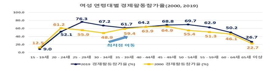 2000년과 2019년의 수치를 비교해보면 경력단절여성 중 40대 비중은 지속 증가하고, 30대 비중은 감소한 점을 발견했습니다.