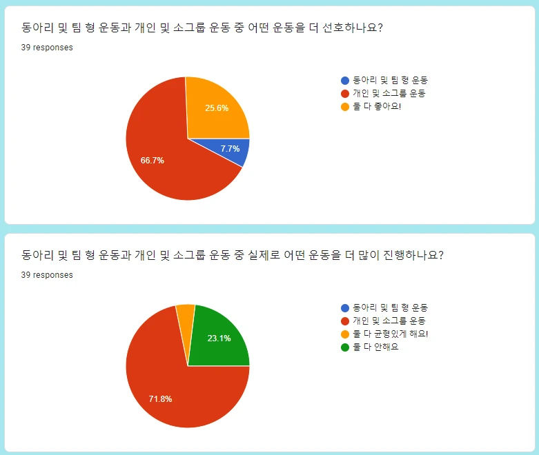 개인 및 소그룹 운동 vs 동아리 및 팀형 운동 어느 것을 선호하고 실제로는 어느 운동을 더 많이 하고 있는지를 여쭤봤습니다.