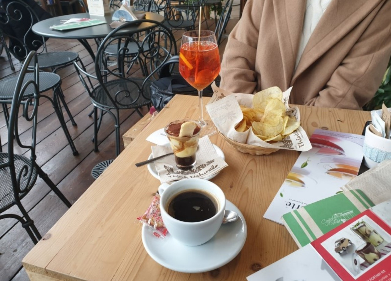 우리는 베네치아 사람들이 즐겨마시는 "스프리츠(Spritz)"라는 음료와 수제 티라미수, 그리고 찰떡같이 한 번에 알아들은 아메리카노를 주문했다. 처음 이탈리아에 왔을 때 아메리카노를 시키면 아메리카노? 미국 커피? 하면서 미간을 찌푸리던 이탈리아에 비하면 정말 많이 발전했다. 이탈리아 사람들은 커피 특히 에스프레소에 대한 자부심이 강한데, 웬만한 관광지가 아니라 동네 카페에서는 아직도 아메리카노를 제조해 주지 않거나, 진한 에스프레소 한 잔에 뜨거운 물을 가져다준다. 이토록 맛있는 커피에 왜 물을 타서 마시는지 이해를 못하는 사람들이다. 속된 말로 똥물이라고도 표현하는데 그래도 요즘은 많이 발전했다. 심지어 아이스 아메리카노를 파는 곳도 생기고 말이다.
