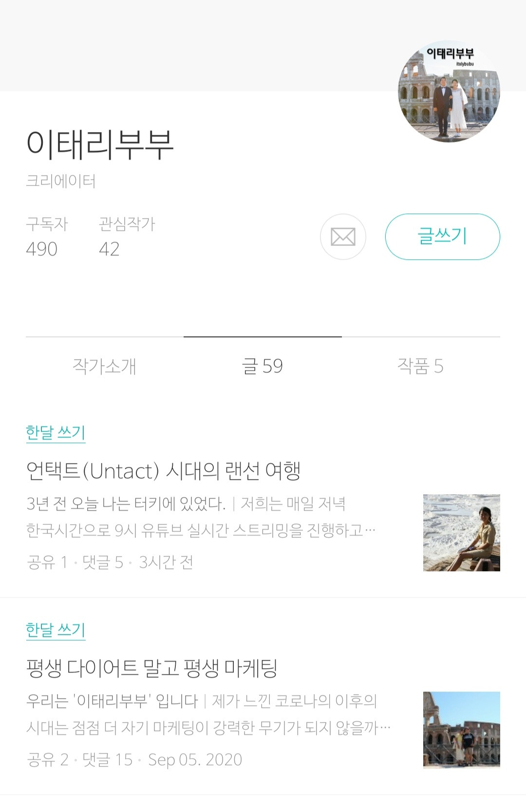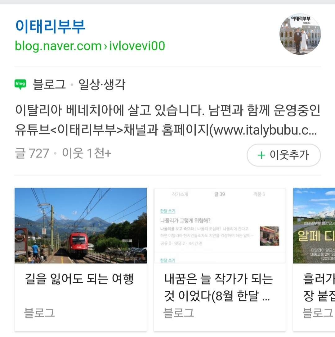 다단계를 모두 정리하고 2)이탈리아에 오면서 2015년 5월부터 지금까지 운영해 오고 있는 '이태리 부부'라는 이름의 네이버 블로그. 이 블로그는 이름도 여러 번 바뀌었지만 지금은 '이태리부부' 라는 이름으로 운영을 하고 있는데, 이탈리아 정착 초창기에는 꾀나 진지하게 장문의 글도 써내려 가고, 이탈리아에 대한 정보도 깊이 있게 다루면서 이탈리아에 살고 있는 한인들과의 소통도 했지만 지금은 다른 플랫폼으로 옮기면서 네이버 블로그는 그저 가끔 일기나 끄적이는 곳으로 전락해 버렸다. 그럼에도 불구하고 이곳에도 6년간 벌써 727개의 글이 쌓였다.