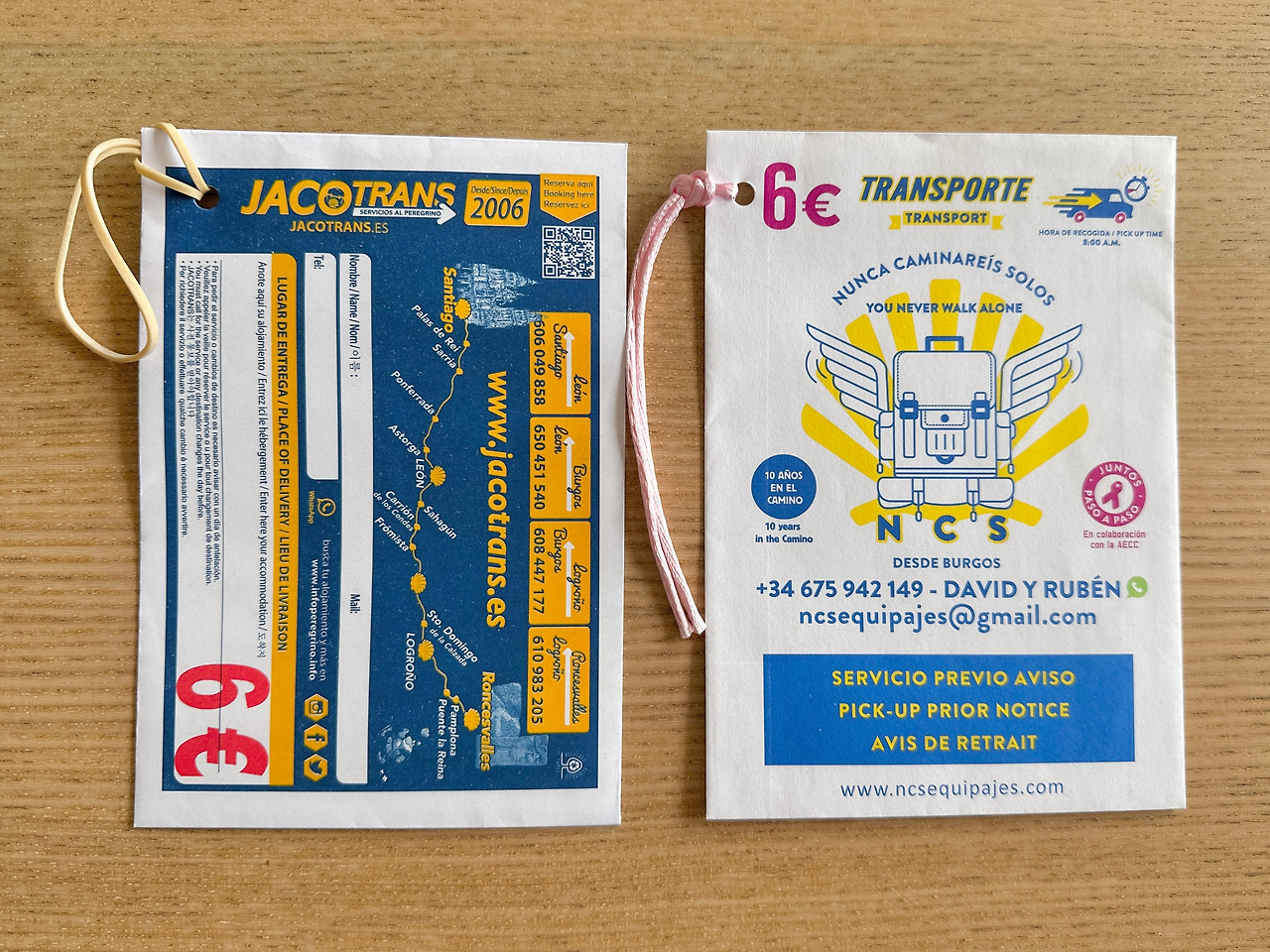 한국인들은 흔히 동키 서비스라고 부르는, 순례길 구간에서 구간으로 하루 단위로 내 짐을 옮겨주는 서비스는 스페인에서는 하코트랜스(Jacotrans)라고 부르는데 엄연히 따지면 가방을 보내주는 업체 중 한 업체의 이름이다. 대표적으로 하코트랜스와 NCS 두 업체가 유명하고 어느 알베르게나 호텔에서든 봉투가 상시 준비되어 있기에 손쉽게 이용할 수 있다. 하지만 NCS는 가방이 잘못 배달되거나 잃어버리는 등의 사건사고가 자자하다고 소문이 나있어서 모두들 가능한 하코트랜스를 이용한다. 혹시나 하코트랜스가 자리가 없어서 예약을 못할 경우가 생기는데 그럴 때는 어쩔 수 없이 NCS를 이용할 수밖에 없다. 내가 다녀온 2023년 9월~10월 사이의 짐 운반 서비스는 한 회당 6유로, 한화 8700원이었고, 사람들이 많아지는 100km 남긴 사리아에서부터는 경쟁 업체들이 많아져 4유로로 가격이 살짝 떨어진다.