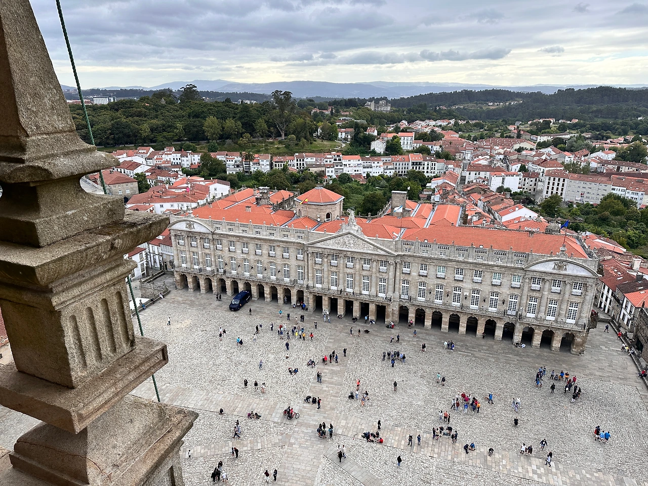 가이드가 끝나고 다시 70개의 계단을 올라 드디어 올라간 탑에서 내려다본 산티아고 마을 전경과 오브라도이로 광장이 아기자기하고 예쁘기만 하다. 아직도 저 멀리 순례자들이 도착하고 있는데 뭔가 아련하기까지 하다.