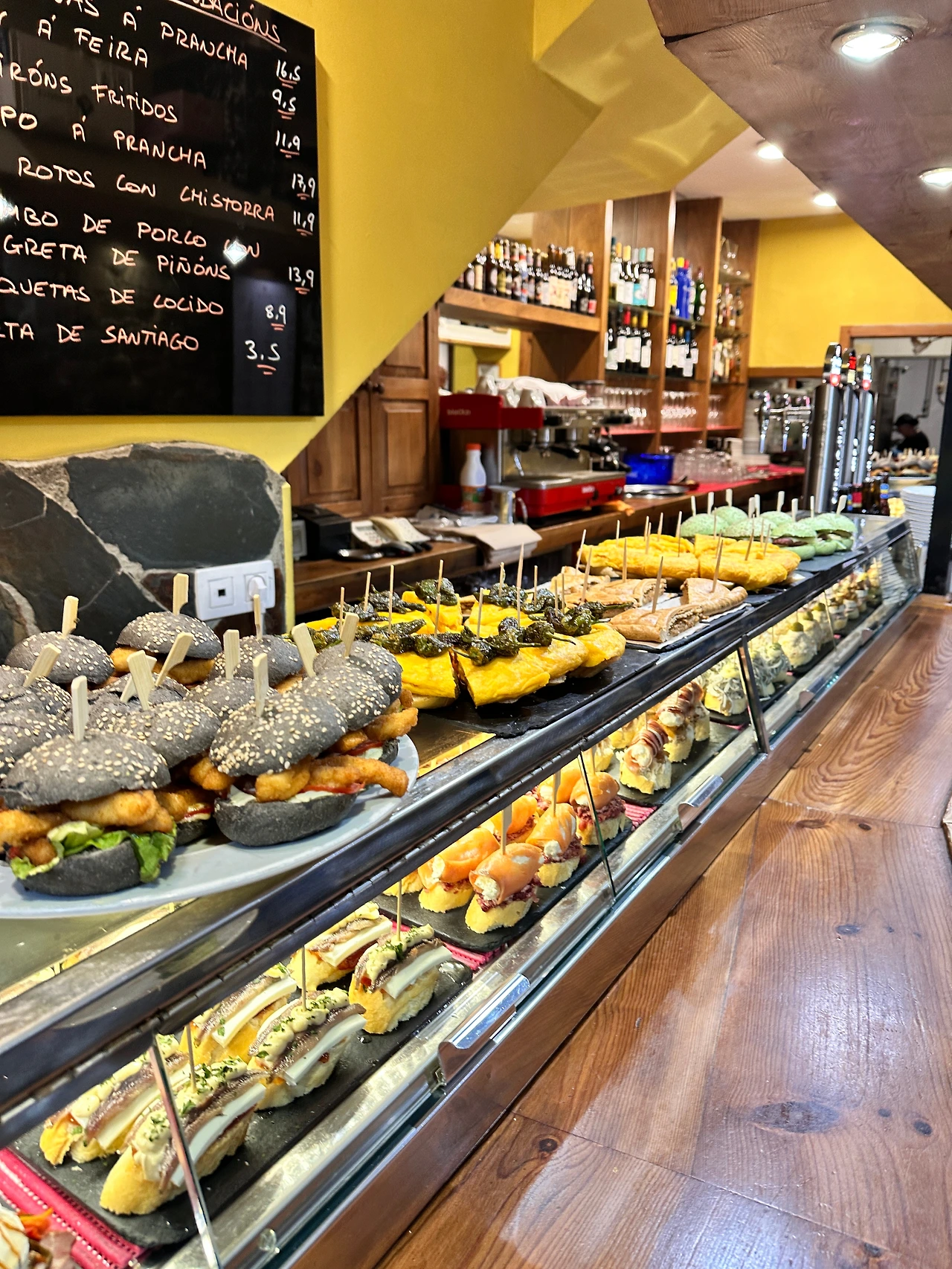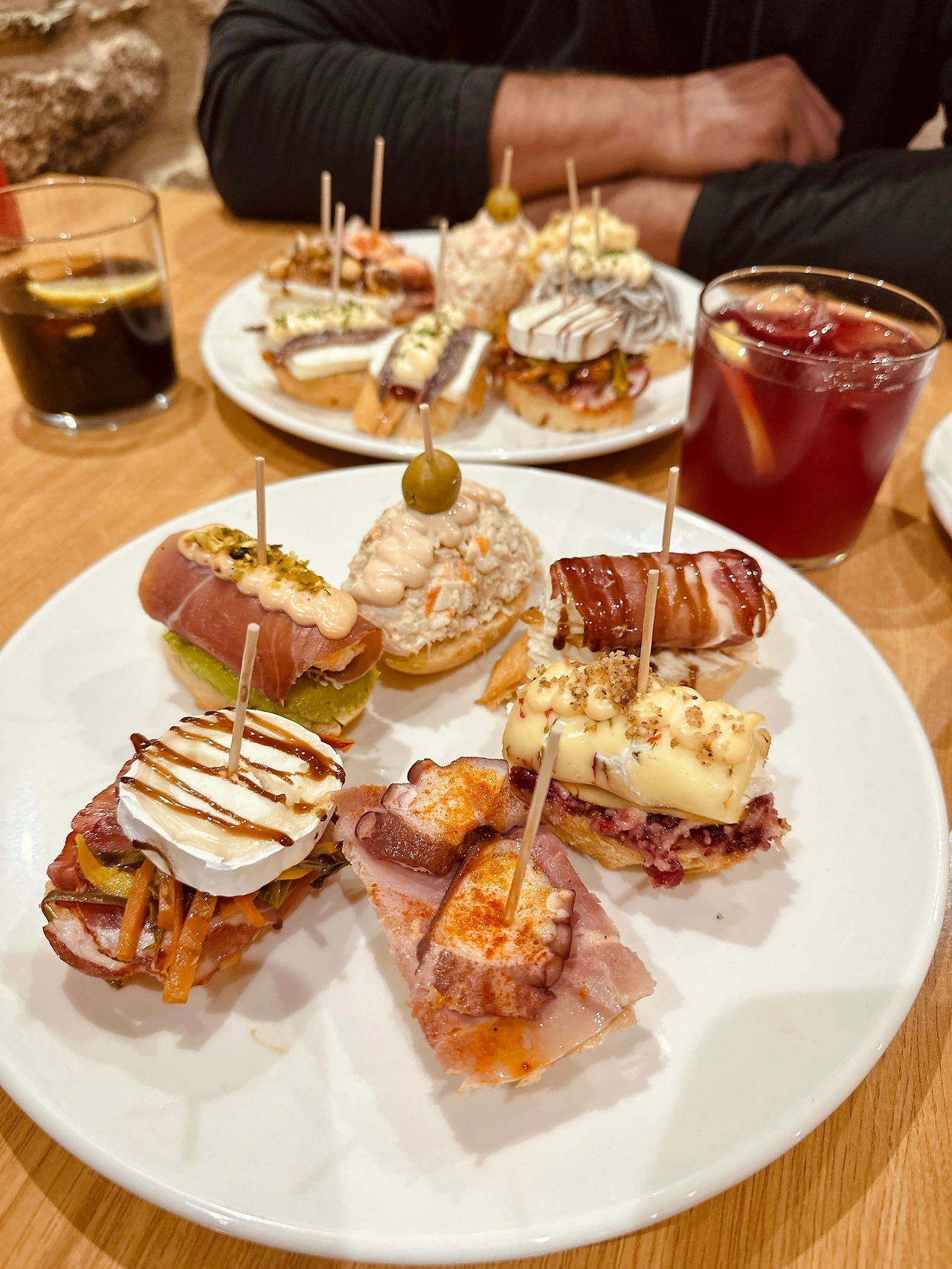 그런데 여기 입장하자마자 너무 재밌다. 자리를 잡고 앉아있는데 서버가 주문을 받으러 오지 않는 거 아닌가? 그리고 손님들이 접시를 가지고 바에서 자꾸 타파스를 말없이 집어간다. 슬쩍 물어보니 옆에 준비된 접시를 들고 내가 손으로 원하는 걸 집어다가 먹으면 된다고 한다. 이런 곳은 난생처음이다! 그럼 내가 뭘 먹었는지 어떻게 알고 나중에 계산을 할까 의아해하니 먹고 남긴 꼬치의 개수와 모양으로 계산한다고 한다. 아 너무 재밌다.