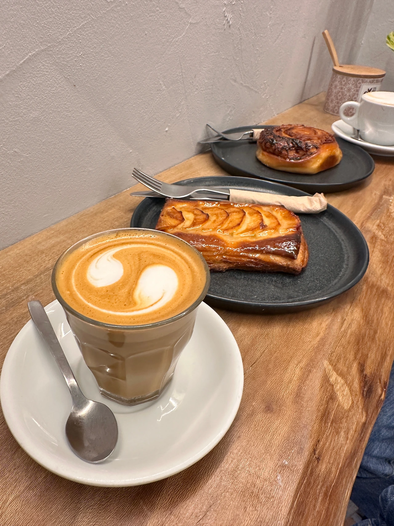 산티아고에서 맞이하는 생일 아침식사는 작년에 순례길 끝낸 후 언니와 함께 했던 카페 Ratinos에서 플랫화이트에 애플파이로 골랐다. 이 근방에서는 맛있는 커피로 평점이 가장 높기에 고민 없이 선택했고 여전히 맛있는데 커피에 진심인 이탈리안 신랑은 자기가 시킨 카푸치노가 라떼에 가깝다며 눈썹을 치켜올린다. 그러게 무난하게 에스프레소로 가지 평소 시키지도 않던 카푸치노를 시키고 그랴. 내 생일 내가 먹고 싶은 걸 먹어서 나 행복하게 시작했으면 된 거다.