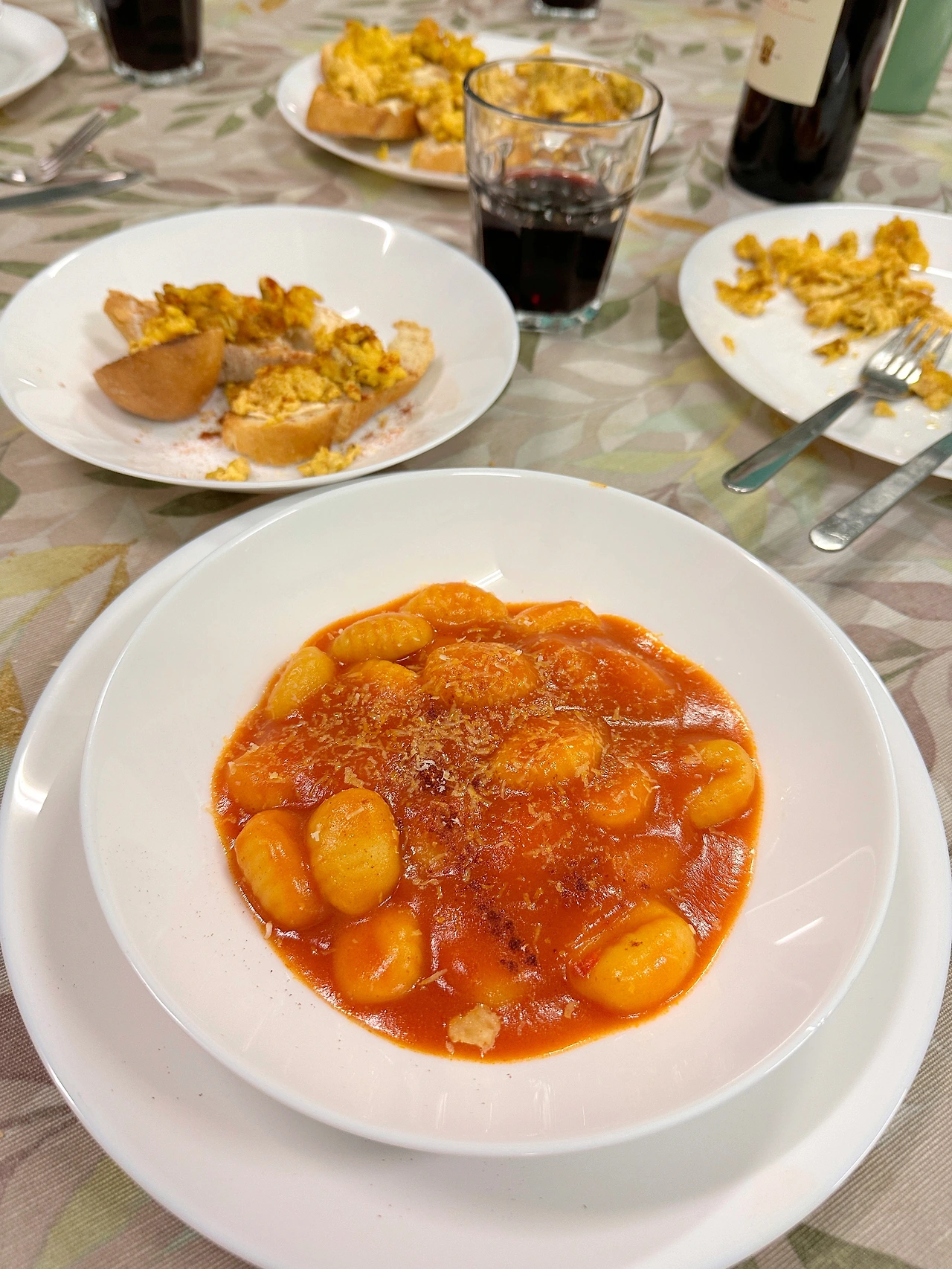 니콜라는 아이랜드에서 온 내 자원봉사 동기 디와 함께 먹을 뇨끼 아라비아타를 만들고 계셨는데 꼭 먹고 가라고 이미 저녁 먹었고 배가 부르다는 나를 앉혀 한 그릇 가득 내어주신다. 스크램블 계란에 크림치즈를 발라 간단한 부르스케타도 만들어 주시고, 후식으로는 무화과 젤리를 올린 빵을 내미신다. 배 너무 부르다고 손사래를 쳐도 아주 단호하게