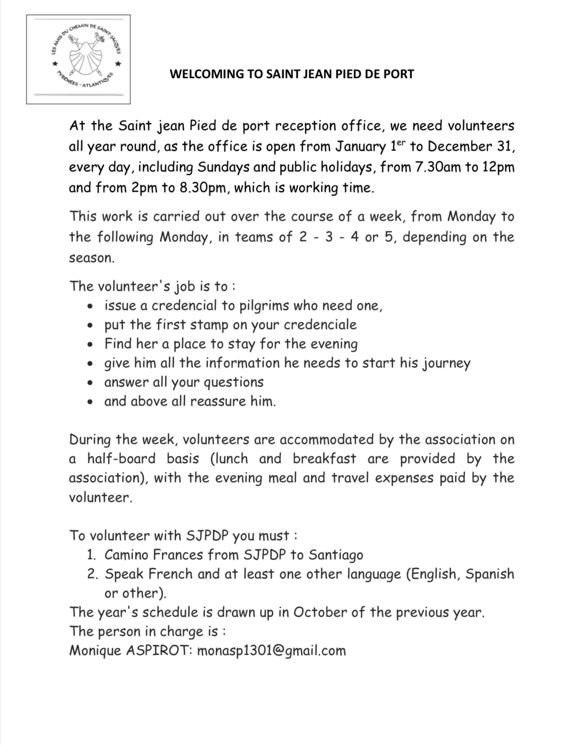 생장피에드포르 접수처에서는 연중 내내 자원봉사자가 필요합니다. 사무실은 매년 1월 1일부터 12월 31일까지, 일요일과 공휴일을 포함해 매일 오전 7시 30분부터 정오까지, 오후 2시부터 오후 8시 30분까지 운영됩니다. 이 업무는 한 주 단위로, 월요일부터 다음 주 월요일까지 진행되며, 계절에 따라 2명에서 5명까지 한 팀으로 구성됩니다.