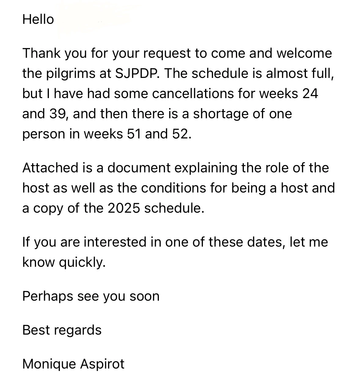 작년 2024년도에 산티아고 데 콤포스텔라의 순례자사무실에 자원봉사를 하기 위해 공식링크를 통해 지원했을 때는 일주일 만에 연락이 왔었다. 이번 프랑스 생장피에드포르의 순례자 사무실에 지원한 건 네이버 검색을 통해 발견한 6년 전 어느 분의 글에 첨부되어 있던 명함 한 장을 보고 비공식 루트로 지원 의사를 밝힌 거라 큰 기대는 없었단 말이지. 그런데! 만 24시간이 안되어 메일이 도착했다. 아니 이렇게 빨리? 메일을 열기 전 마음이 빨라진다.