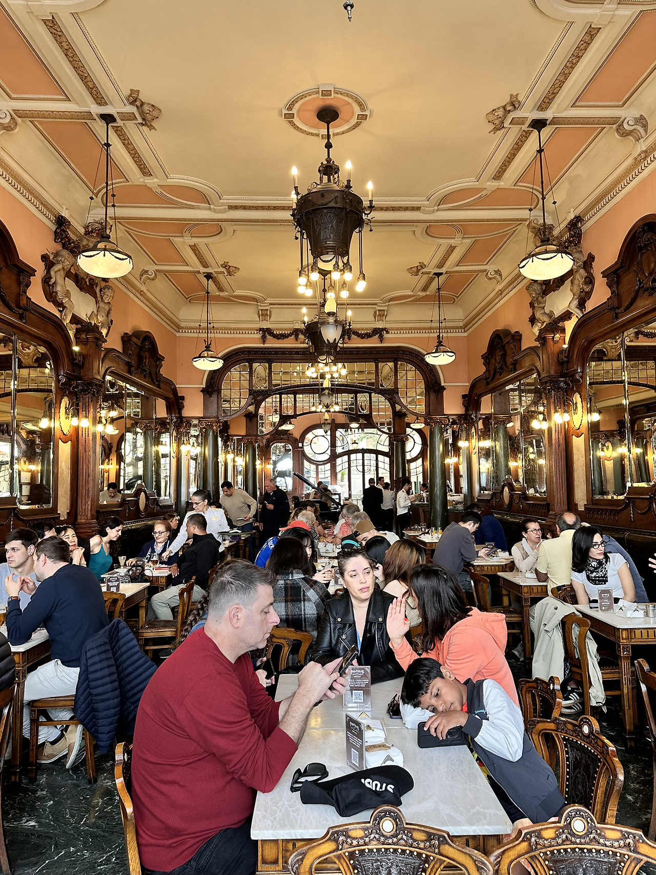 우리 엄마는 너는 어떻게 이렇게 길을 잘 아냐며 계속 신기해하시는데 저야 아직 젊고 구글맵이 있으니까요! 나름 한번 와본 곳이라고 자신감도 있을뿐더러 지난 이틀간 포르투를 돌아다니며 엄마 아빠와 함께 올 것 같은 곳들은 미리 눈여겨보고 경로에 넣어 둔 게 도움이 되었다. 조앤 롤링이 해리포터를 집필하기도 했었다는 마제스틱 카페는 나도 이번이 처음이었는데 1920년대 포르투 상류층과 예술가들의 사교 장소였던 만큼 고풍스러움이 느껴져 분위기 있게 간식을 먹으며 한숨 쉬어갔다. 이곳의 가장 유명한 메뉴인 포르투갈의 프렌치토스트 라바나다와 커피 봄바를 시키고 아빠는 맥주 한 잔. 곧 점심을 먹을 거 기에 거하게 시키지는 않았지만 나름 고급진 맛이라며 라바나다 평을 하는 부모님을 마주하고 있으니 오래간만에 서울에서 했을 법한 카페 나들이를 하는 느낌이 들어 기분이 몽글몽글하다.