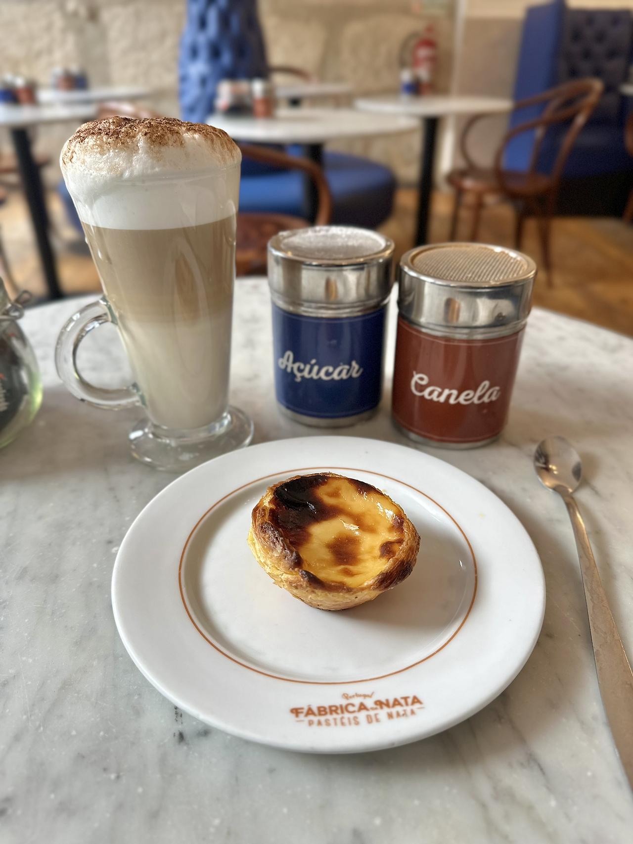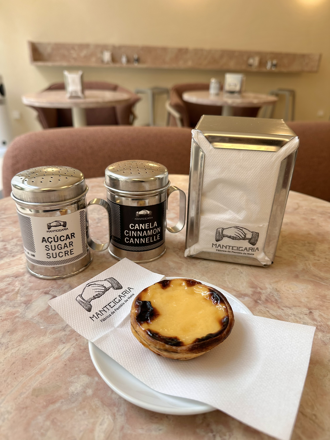 커피를 마시러 가면 설탕과 스위트너가 곳곳의 테이블에 미리 준비되어 있듯이 에그타르트 집에 가면 기본으로 계피가루와 슈가파우더가 준비되어 있다. 어느 가게던지, 어느 테이블이던지 늘 찾을 수 있는데 바로 에그타르트 즉 나타에 뿌려 먹어야 하기 때문이다. 향신료 통의 구멍들이 크고 많아서 생각 없이 위에서 통을 제치는 순간 가루 폭탄을 맞으니 조심해야 한다. 에그타르트에 가까이 대고 톡톡, 약하게 흔들면 원하는 만큼 양조절이 가능하다. 슈가 파우더는 당연히 당도 조절 용인건 알겠는데 그럼 계피 가루는 뭐지? 알고 보니 계피가루는 포르투갈에서 예전부터 귀한 향신료에 속했고 특히 수도원 안에서 디저트에 넣는 향신료로 많이 사용되었다고 한다. 그저 맛과 향뿐만이 아니라 시나몬이 에그타르트의 단맛을 강조하면서도 느끼함을 잡아주기에 사용한다는 사실. 어우~ 포르투갈 사람들 맛잘알이네. 오래전부터 어떤 향신료들이 어떤 디저트의 맛을 더 극대화시키는지 알았던 배운 사람들이었군, 참 재밌다. 개인적으로 나타의 커스터드가 가게마다 다르긴 하지만 대부분이 정도의 차이일 뿐 어느 정도의 달달함을 갖고 있기 때문에 슈가파우더는 생략하고, 계피 가루만 두어 번 뿌려먹곤 한다. 그런데 신기하게도 눈에 보여서 그런지 늘 세트로 붙어있는 계피 + 슈가파우더 통을 보고 있으면 뭔가 아쉬워 슈가파우더도 한 번 뿌려주게 된다. 슈가파우더가 삐지면 안 되잖아… 포르투에서 에그타르트를 먹을 때 우리도 현지인들처럼 계피가루, 슈가파우더 뿌리는 것도 잊지 말고 따라 해 보자. 이 둘을 뿌렸을 때와 안 뿌리고 먹었을 때 맛의 풍미가 어떻게 되는지 비교해 보며 맛보는 것도 재밌을 것이다.