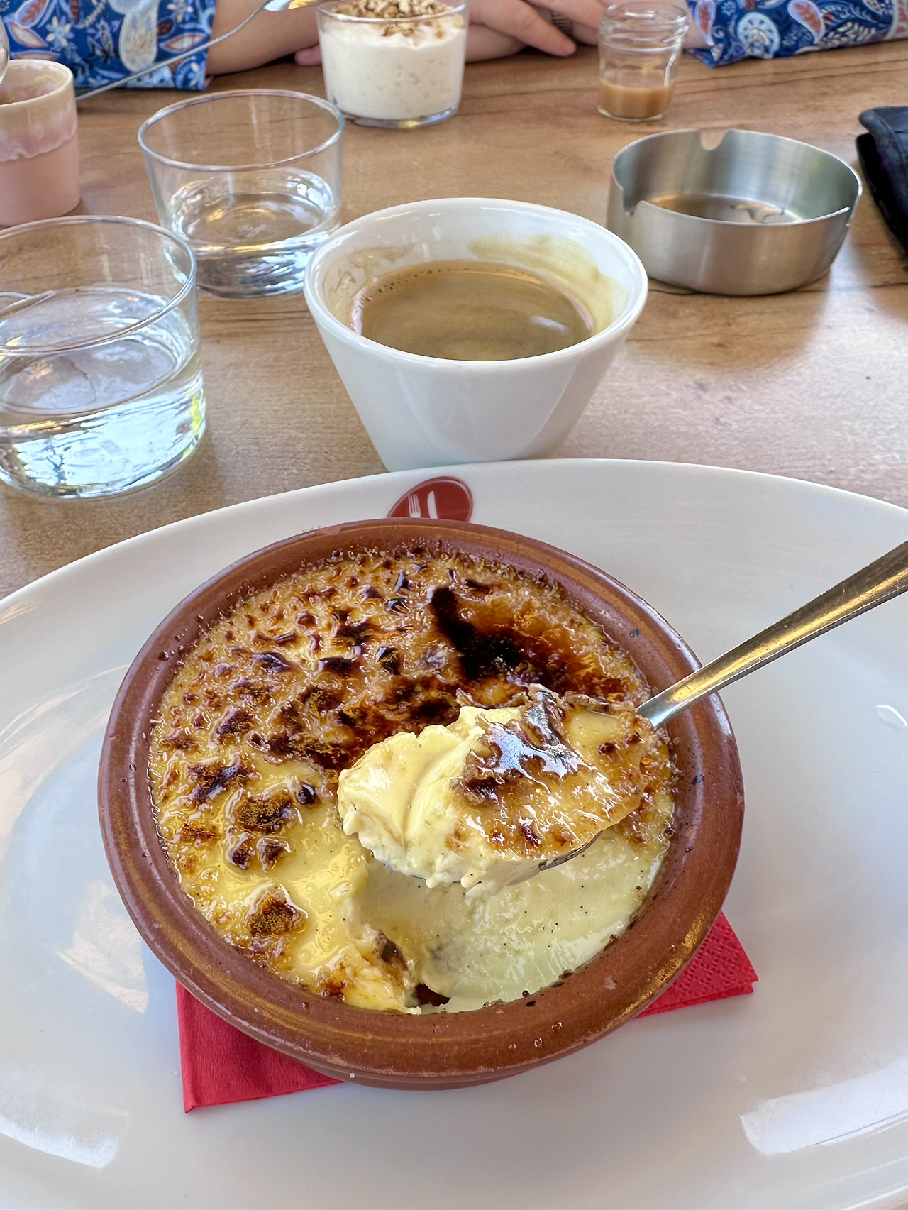 오늘 내가 선택한 메뉴는 Boudin Maison Grillé라는 프랑스식 수제 소시지에 이곳 바스크 지방의 피망과 고추가 들어가 매콤한 야채볶음 ‘피퍼라드’가 함께 나오는 음식이다. 수제 소시지는 역시 유럽이야! 매콤한 야채볶음과 함께 먹으니 느끼함 하나 없이 개운한 게 진짜 바스크 사람들 입맛이 약간 한국과 비슷하다는 생각이 든다. 자원봉사자 식구들이 시킨 다양한 해산물 샐러드, 해산물 파스타들도 보기에 양도 많고 모두가 여기 음식은 진짜 맛있다고 극찬을 했기에 추천하는 식당이다. 가는 날이 다 되어 이곳에서 식사를 하게 된 게 살짝 아쉬울 정도였다니까. 식사를 하면서 우리의 이야기는 언제나 자연스럽게 순례자들에 관해 이야기로 귀결되는데 오늘의 메인은 단연 시간차를 두고 오셨던 미국 투어 그룹분들이었지. 그 외에도 다른 흥미 있는 사연의 순례자들, 그분들이 전해주신 이야기들로 우리의 식탁은 늘 순례길 바이브로 충만하니 언제 또 이렇게 순례길 이야기를 많이 할 수 있을까 싶다. 식사를 마치고 오늘은 디저트에 커피까지 시켜 우리의 마지막 만찬을 즐겼다. 이곳 Café Ttipia는 디저트도 정말 맛있으니 꼭꼭 디저트까지 챙겨드시길! 디저트 종류도 다양한데 난 당연히 프랑스니까 크렘브륄레를 시켰지. 원래 크렘브륄레를 정말 좋아해서 꾀나 많이 먹어봤다고 자부하는데 여기 거진 내 인생 크렘브륄레 탑 3에 든다! 바닐라맛도 시럽이 아닌 바닐라 빈을 썼고 양도 넉넉한 게 진짜 맛있었다. 이렇게 좋은 사람들과 마음에 쏙 드는 프랑스음식을 먹으며 오후에 일할 힘을 제대로 충전한, 마음도 배도 꽉 찬 즐거운 점심이었다.
