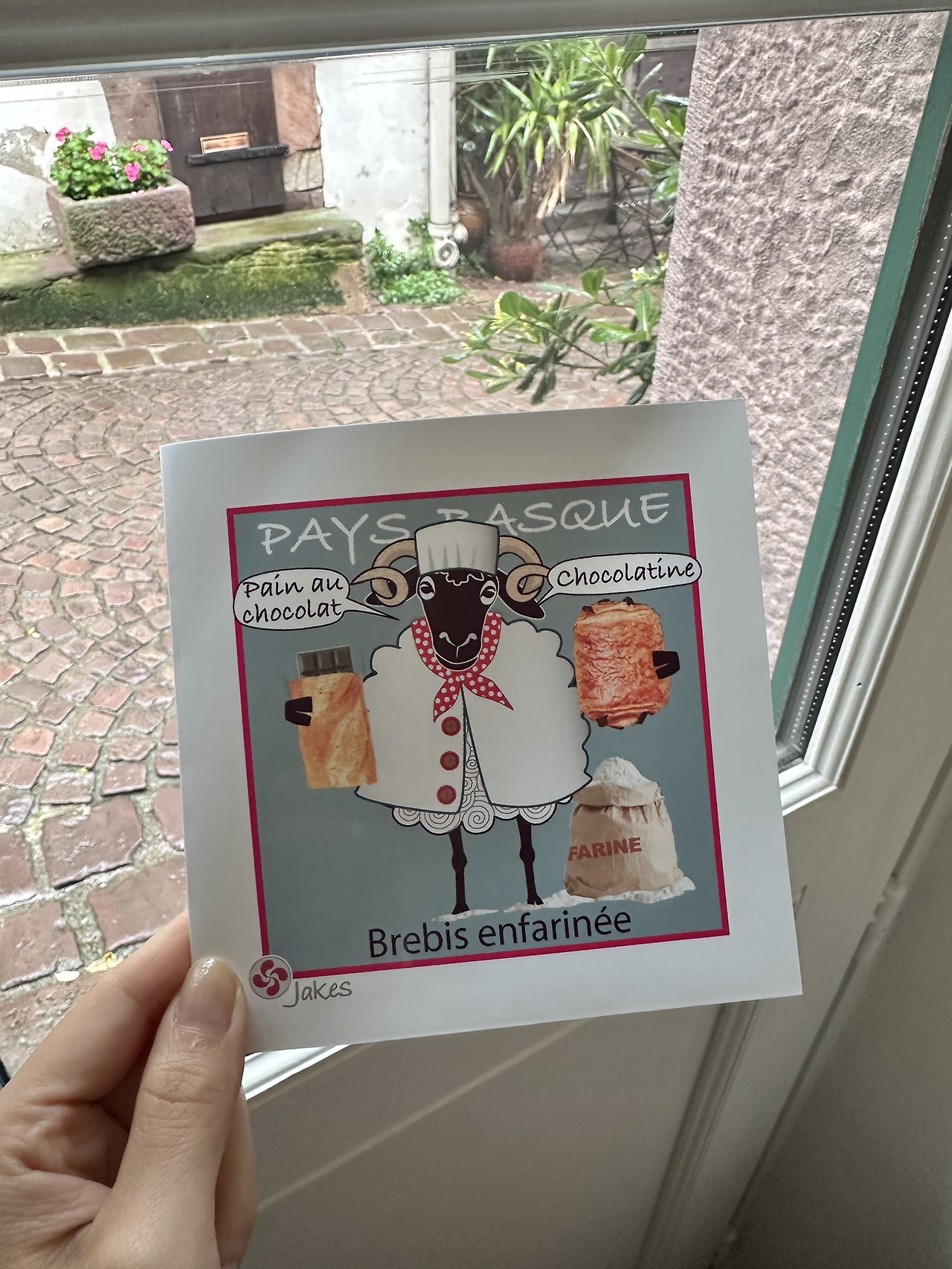 우리의 근무도 끝났고, 점심도 먹었고, 아일린은 떠났고, 오리손 산장에서 커피까지 했겠다 생장으로 돌아와서 이제는 쉴 시간이었다. 저녁 6시 반에 레스토랑 Café Ttipia에서 만나기로 하고 각자의 알베르게, 집에서 쉬다 만나기로 했다. 하룻밤만 자고 갈 거라 필요한 것만 조그맣게 짐을 풀어놓고 아까 받은 아이린의 카드를 열어보았다. 스윗한 글과 함께 카드도 나에게 딱 어울리는 게 고심해서 카드를 고르는 아이린의 모습을 쉽게 떠올릴 수 있었다. 이 카드는 바스크 지역의 명물인 양을 캐릭터로 한 건데 양이 “빵 오 쇼콜라? 쇼콜라틴!” 의 뉘앙스로 빵 오 쇼콜라는 말 그대로 빵 그리고 초콜릿이고, 이곳 바스크에서는 쇼콜라틴으로 불러야 한다는 의미를 담고 있다. 이게 우리끼리 인사이드 조크였던 게 내가 크로와상을 아침으로 사 온 날 모두에게 “내일은 빵 오 쇼콜라 사 올게.” 했다가 미셸린이 파리와 같은 북부에서나 빵 오 쇼콜라라고 하지 여기 남부에서는 무조건 쇼콜라틴이라고 불러야 한다고 참 교육을 해줬었거든. 아이린이 그걸 기억하고 재치 있게도 내 카드로 바로 이 내용을 담은 걸 골라 써준 것이니 너무 귀엽잖아! 아일린이 카드에 써 준 내용처럼 우리 꼭 내년 이맘때 다시 다 같이 만나서 같이 봉사하는 그날이 왔으면 좋겠다는 생각을 해보는 오래간만에 느긋한 오후다.