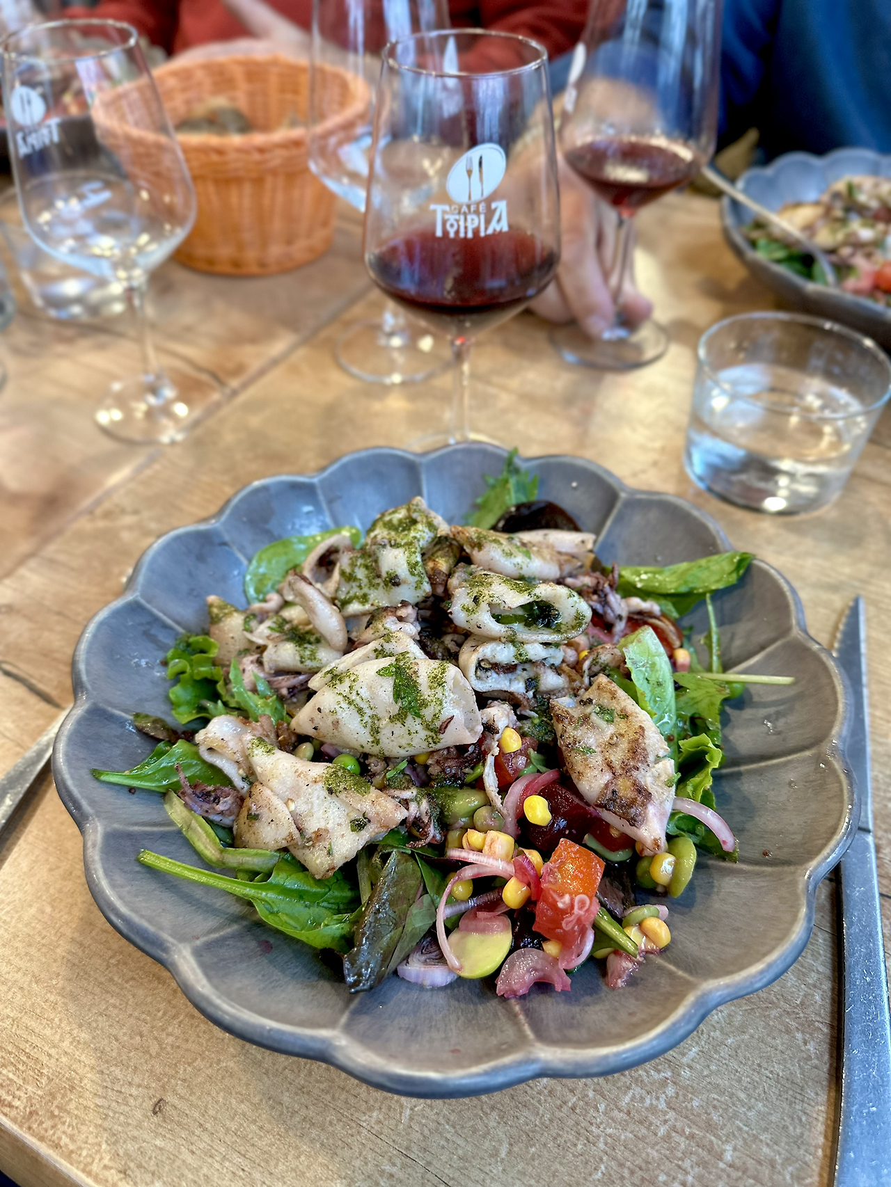 푹 쉬다보니 어느새 저녁 먹을 시간이 다가와 조세, 미셸린, 장 베누와 그리고 나 이렇게 4명이 Café Ttipia에 모였다. 처음 시킨 샹그리아로는 비 오는 날 열심히 순례길을 걸어낸 아이린을 위해 잔을 기울였고, 두 번째 술로 고른 와인으로는 우리보다 먼저 떠나 끝까지 함께하지 못했던 버나드를 위해 잔을 기울였다. 오늘은 뭘 먹을까 고민하다가 어제 장 베누와랑 조세가 시켜 정말 맛있어 보였던 구운 오징어 샐러드를 시켰는데 와… 대박… 나 이렇게 맛있는 해산물 샐러드 처음이야! 눈이 휘둥그레지는 맛에 정말 강력 추천하고 싶다. 얼마나 맛있냐면 어제 이 구운 오징어 샐러드를 점심으로 먹었던 장 베누와랑 호세 두 분 다 오늘 저녁으로 이 샐러드를 다시 주문하셨을 정도. 유럽사람들 대부분 같은 음식 연달아 먹지 않는데 말이야 얼마나 맛있으면 어제 먹고 또 시키셨겠어. 이게 일단 드레싱이 범벅되어있지 않고 오일 조금에 살짝의 소금 간만 되어있는 게 맛이 고급스러운 데다 오징어 양이 아주 많고 야채들이 신선해 너무 맛있었다. 개인적으로 해산물 안 즐기는 내가 ‘이거 뭐지? 왜 이렇게 맛있지?’ 생각하며 먹은 정말 몇 손꼽게 맛있는 샐러드였고 양도 많아 끝에 몇 입 남겼을 정도로 푸짐했다. 무엇보다 작은 오징어들이 기가 막히게 탱글하단 말이야. 너무 질기지도, 너무 단단하지도 않게 진짜 잘 익혀서 감탄했으니 이곳에 가게 된다면 식사 대용으로도 충분하니 꼭 시도해 보시길 바란다.