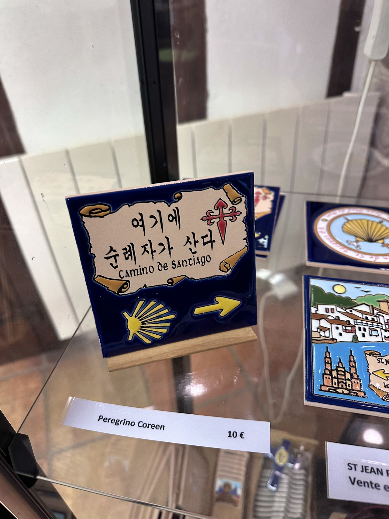 마그넷 다음으로 가장 많이 준비된 건 타일 들인데 재밌게도 한국어로 된 ‘여기에 순례자가 산다’라는 타일도 볼 수 있다. 크기는 대략 손바닥 사이즈로 너무 크지도 않고, 너무 작지도 않다. 매년 프랑스길을 걷기 위해 생장을 방문하는 순례자들의 국적 통계를 보면 한국인이 1위 프랑스인, 2위 미국인들을 뒤이어 3위라고 하니 이렇게 프랑스길에서 한국인들만을 위한 각별한 애정을 담아 제작된 기념품도 이해가 간다. 타일 중 생장의 풍경을 담은 건 15유로(2만 4천 원), 산티아고 대성당 그림과 온도계가 합쳐진 타일은 이곳 생장 순례자 사무소에서 가장 비싼 기념품으로 20유로(3만 2천 원)이고 십자가들은 각 15유로(2만 4천 원)인데 한국어로 된 타일과 생장이 그려진 타일 말고는 웬만해서 비슷한 타일들은 산티아고에서 구할 수 있다. 타일 재질 자체가 가방 안에 반듯하게 잘 넣고 다녀야지 자칫하면 가방 속에서 뽀각하고 어딘가 깨질 수 있으니 그냥 이런 아이템이 있구나 눈으로 보시는 것만으로 충분하실 것 같다.