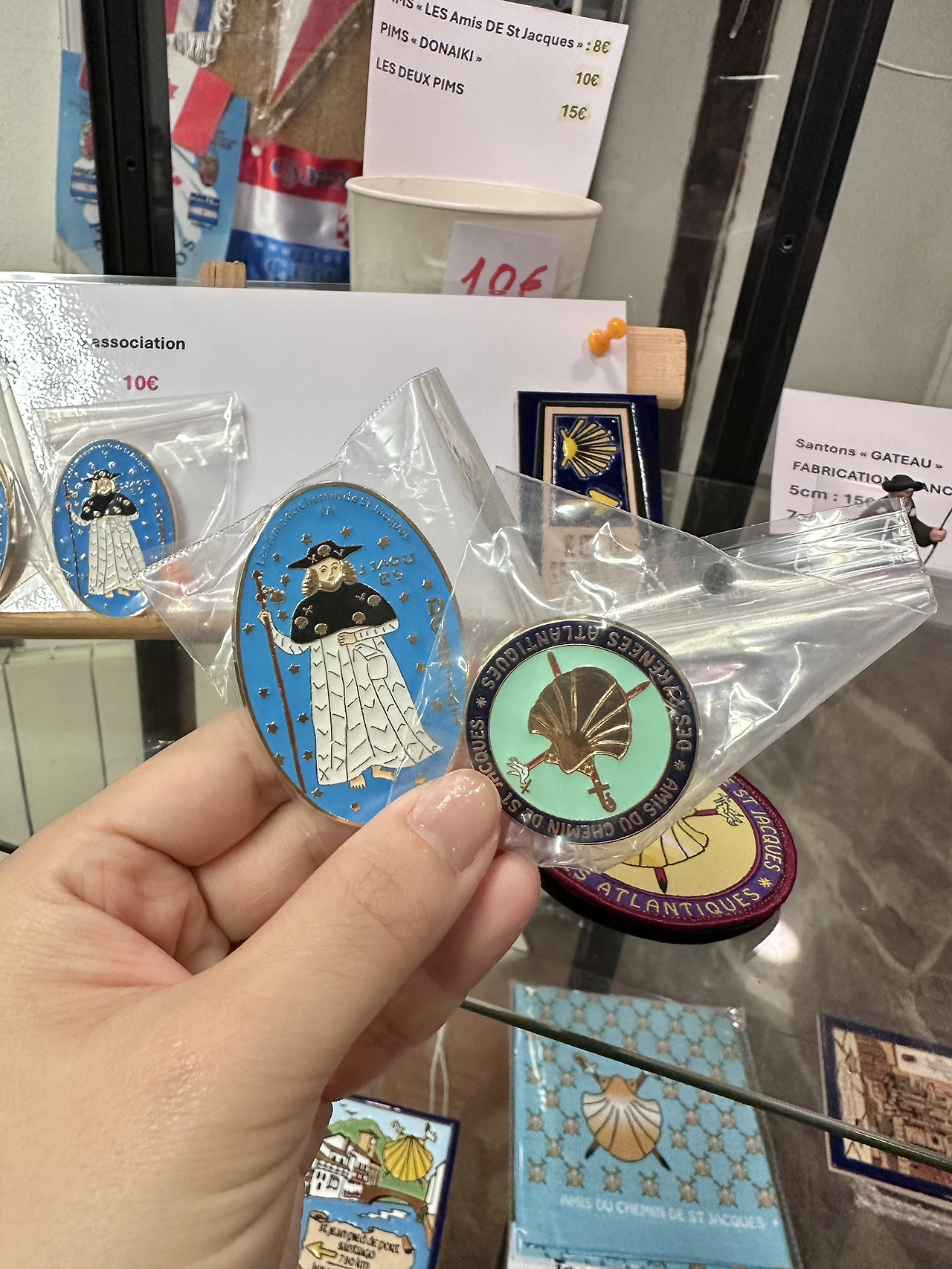 종류는 크게 자석, 핀(배지), 타일 장식품, 피겨, 티셔프와 목 스카프로 나뉘고 가격대는 가장 저렴한 게 8유로(1만 2천 원)의 자서들과 핀, 목 스카프였고 가장 비싼 건 20유로(3만 2천 원)의 타일재질 기념품의 온도계였다. 개인적으로 자석들은 다 패스하셔도 되는 게 산티아고에서도 많이 팔 뿐더러 프랑스 길에 특화된 유니크한 자석들은 아니었다. 솔직히 똑같은 재질의 비슷한 자석들을 산티아고에서는 3유로 정도면 사실 수 있으니 디자인과 희소성, 가격 면에서 이건 아쉬움 없게 거르셔도 될 것 같다. 내가 가장 마음에 든 건 배지들이었는데 이곳 생장 순례자 사무실에선 딱 2 디자인만 파는데 둘 다 크기가 꽤 크고 색깔이 예뻐서 존재감이 있었다. 마감도 정말 좋은 데다가 이건 이곳 생장 순례자 사무실에서만 파는 거라 너무 마음에 들지 뭐야. 프랑스길 31일 걸으며 이와 같은 배지는 단 한 번도 본 적이 없고 당연히 산티아고에서도 없었기에 이건 사가도 될 것 같아 추천한다. 왼쪽의 산티아고 성인이 그려진 긴 배지는 10유로(1만 6천 원), 오른쪽 프랑스길 순례자 연합회 배지는 8유로 (1만 2천 원)이니 참고하시기 바란다. 개인적으로 프랑스 순례길을 계획하는 누군가에게 딱 하나만 선물할 수 있다면 왼쪽의 하늘색 산티아고 성인 배지를 선물할 것 같다. 내가 본 순례길 배지 중에 가장 특이하고, 가장 크고, 가장 예뻤다.