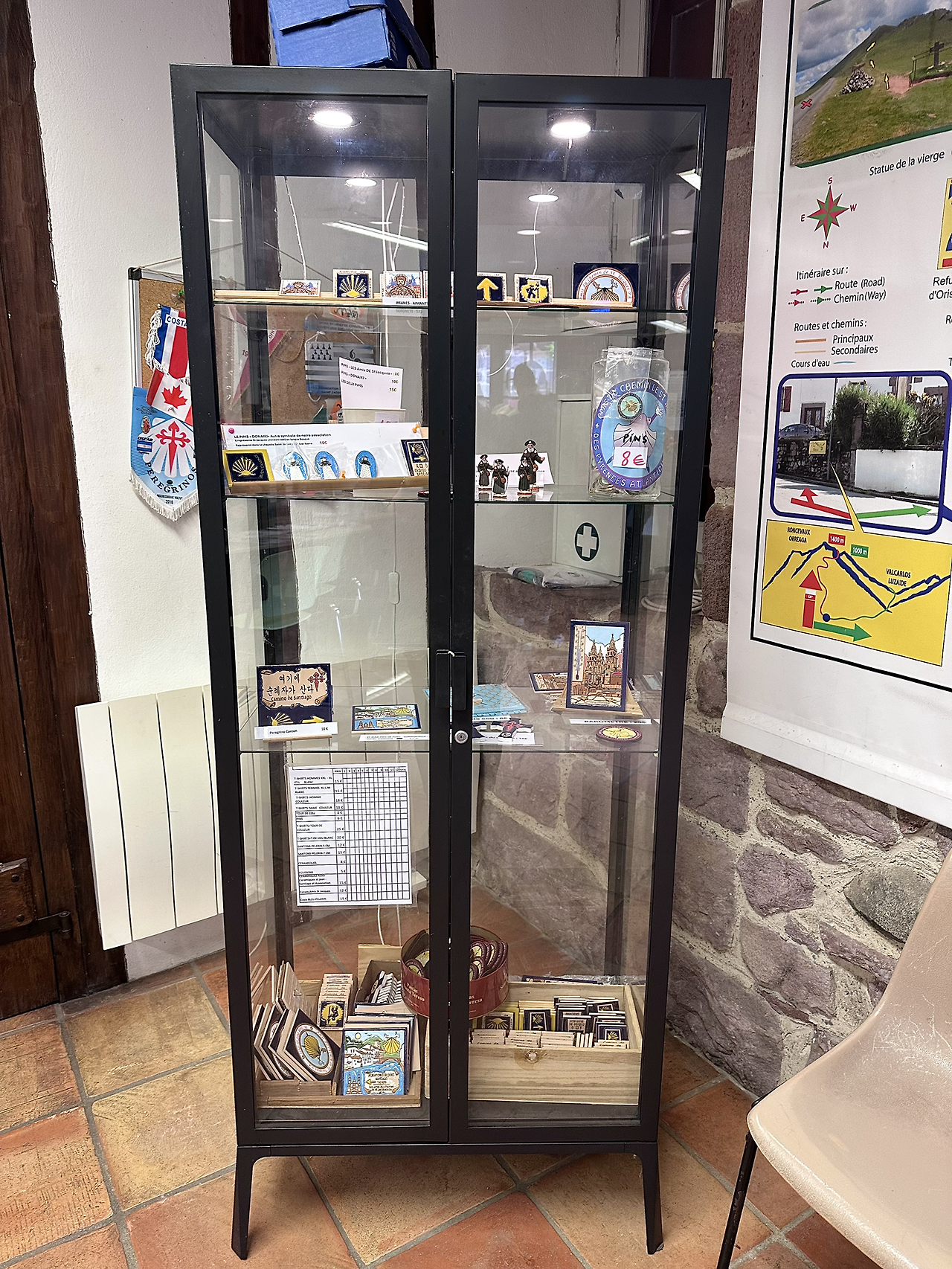 이번에 생장 순례자 사무실에서 자원봉사를 하면서 새롭게 발견한 것 중 놀라운 게 하나 있는데 순례자 사무실에서 프랑스 순례길 관련 기념품들을 판매한다는 거다. 아 이거 나만 몰랐어? 내가 순례자로 생장 순례자 사무실을 방문했을 때는 버스를 타고 와서 오후 2시에 도착했었는데 그때가 브레이크 타임 끝나고 다시 문을 열 때라 사람들도 다 줄 서 있고 조금 정신이 없었단 말이지. 처음이라 나름 긴장도 했고, 줄 서서 안에 들어가서도 내 차례에 앞에 놓인 5개의 테이블 중 어디에서 부를지 모르니 계속 전방주시만 하고 있어 주위를 둘러볼 여유도 없었다. 게다가 봉사자에게 설명을 다 듣고도 바글바글한 사람들 속에 얼른 다음 사람에게 자리를 내줘야 한다는 압박감이 들어 바로 사무실을 빠져나왔었다. 그런데 조개 도네이션 바(입구에서 들어가자마자 보이는 정면, 가장 안쪽, 출입불가한 문 왼쪽) 바로 옆에 위치한 긴 장식장에서 다양한 프랑스 길 기념품을 파는 걸 이번에 알았네! 이게 분명 2023년도에도 있었을 텐데 내가 긴장해서 못 본거지 뭐야. 프랑스길과 관련된 기념품 들 중 이곳 생장 순례자 사무실에서만 살 수 있는 물건들이 있어서 그때 알았다면 분명 무언가를 사 왔을 것 같은데 거참 정말 아는 만큼 보이는 것 같아. 자석과 핀은 물론 티셔츠와 다용도 스카프까지 팔고 있으니 지금 나와 함께 살펴보고, 혹시나 마음에 드시는 게 있다면 프랑스길을 시작하며 순례자 여권을 받고 첫 도장받으실 때 구입하시면 좋을 것 같다.