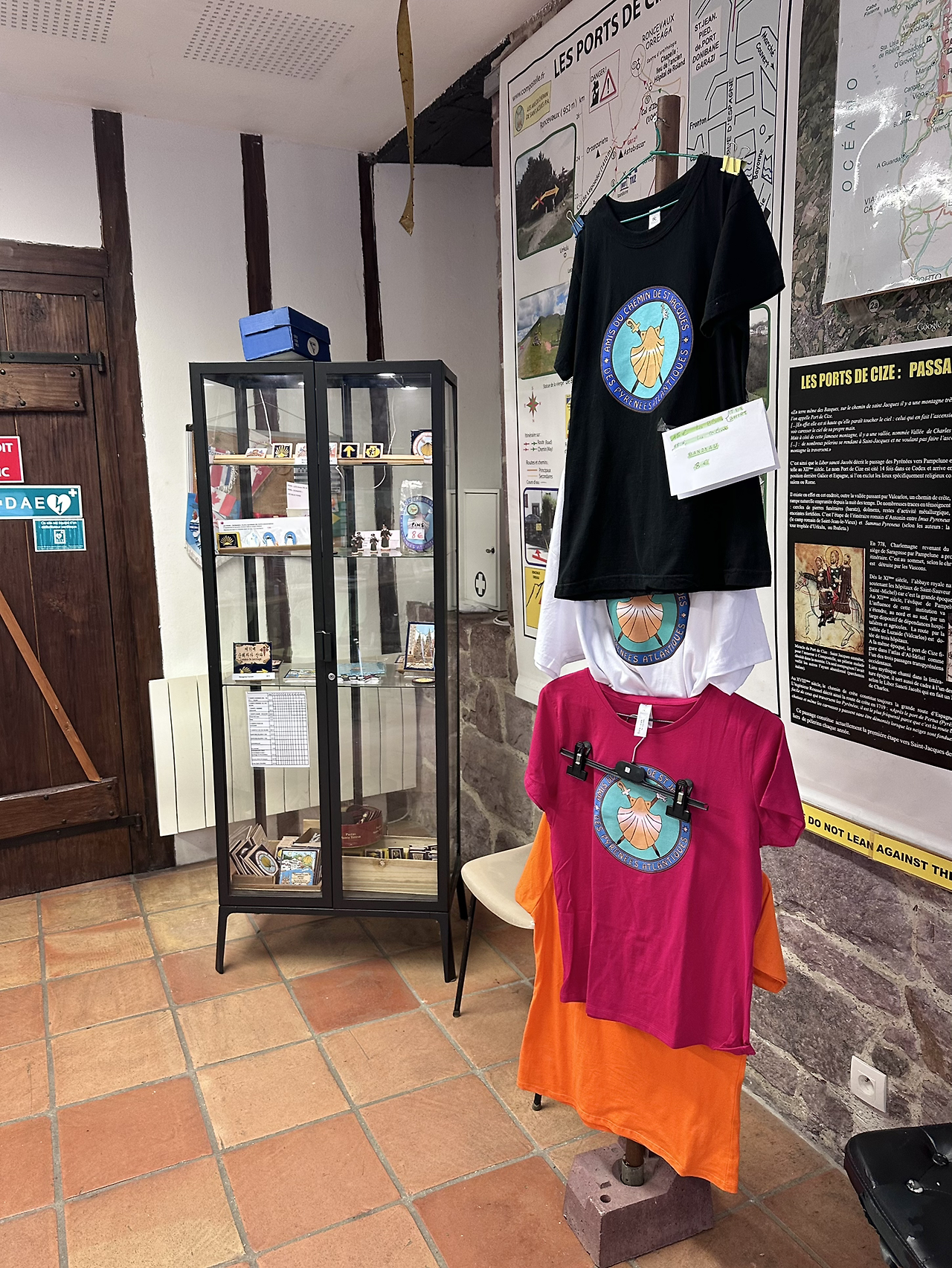 생장 순례자 사무실은 산티아고 순례자 사무실과 달리 기념품만 판매하는 매대와 직원이 따로 있지 않다. 그래서 유리 장식장 안에 들어있는 기념품 중 마음에 드시는 게 있거나 티셔츠나 스카프를 사기로 마음을 정하셨으면 순례자 응대를 하고 있지 않은 자원봉사자에게 물어봐야한다. 여유가 있는 자원봉사자의 데스크로 가서 기념품을 사고 싶다고 말씀하시고 어떤 걸 원하는지 말씀하시면 꺼내드리는 시스템이다. 특히나 티셔츠는 사이즈 비교도 해보셔야 하기에 원하신다면 고민하는 사이즈를 열어 보여드리기도 한다. 구매하는데 한 가지 팁을 드리자면 오전이나 6시 이후 늦은 오후 조금 덜 붐비는 시간에 오시면 봉사자들이 조금 더 신경 써서 긴 시간 도움 드릴 수 있다는 걸 알아두시면 좋다. 유일하게 주의하실 점은 생장 순례자 사무실은 따로 카드결제기를 가지고 있지 않기 때문에 꼭 현금으로 지불해주셔야 한다. 우리가 순례자 여권을 만들 때도 현금을 내야 하듯이 말이다. 산티아고 순례자 사무실은 모든 순례길이 끝나는 곳이기에 여러 면에서 조금 더 체계적인 시스템을 가지고 있는데 비해 생장은 아직 시스템이 아날로그에 더 가깝다. 이 부분 미리 염두에 두시고 혹시나 위에 알려드린 기념품 중 마음에 드는 게 있으시다면 현금을 준비해 가시길 조언해 드린다.