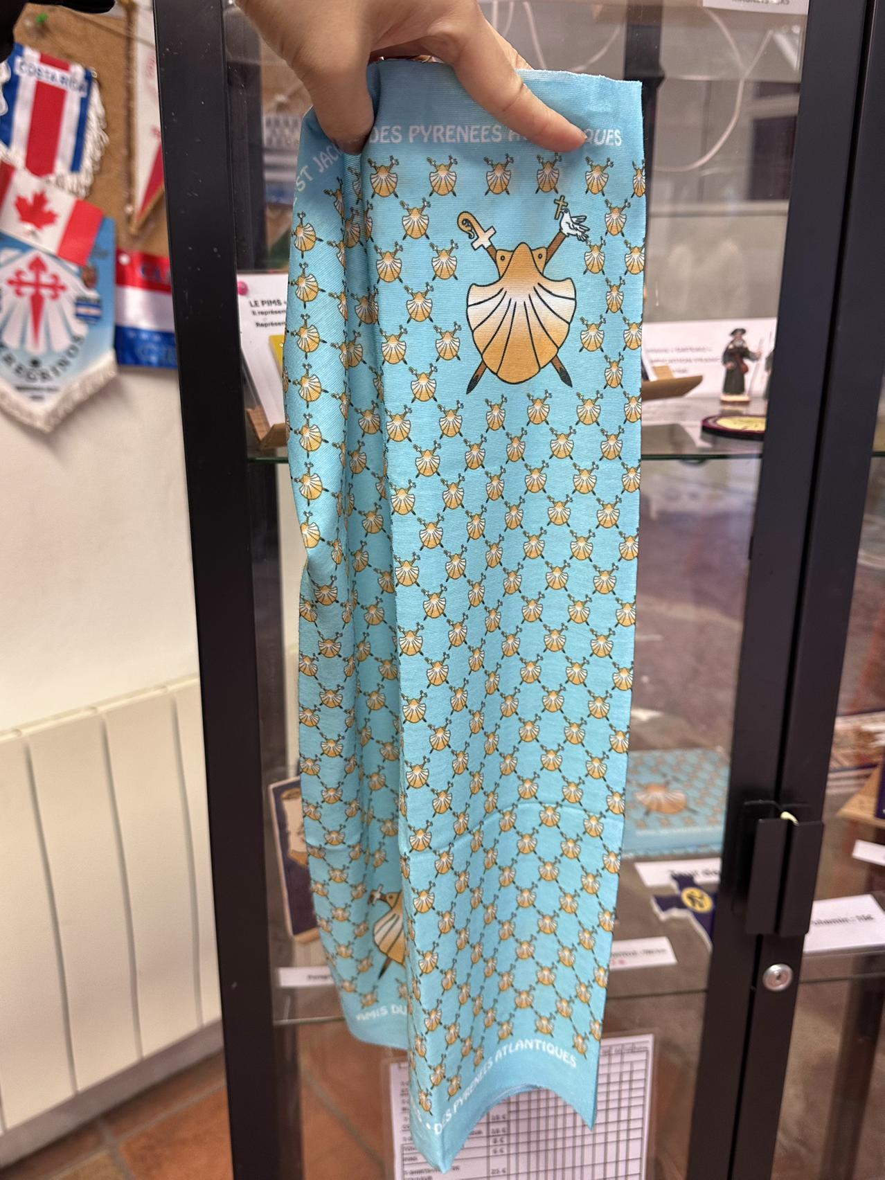 티셔츠는 한 가지 디자인, 프랑스 길 순례자 연합회 로고로 준비되어 있다. 각 색깔별로 다양한 사이즈들이 있기 때문에 크기 걱정은 안 하셔도 된다. 바로 입으실 거라면 문제가 없지만 대부분 기능성 티셔츠들로 이미 만반의 준비들을 해오셨기에 옷도 다 무게인지라 사시는 분이 많지는 않았다. 실용적인 물건 중 하나인 다용도 목 스카프는 청량한 하늘색에 조개 패턴으로 꽤 예뻐 정말 마음에 들었던 기념품이다. 이게 잡아당기면 고무줄 같은 텐션이 있어 머리 사이즈 상관없이 목이든, 머리든 어디에나 쓸 수 있고 땀도 금방 마를 것 같은 소재라 적극 추천한다. 이거야말로 순례길을 걷는데 꾀나 도움이 될 제품이라 내가 순례자라면 이걸 하나 사서 한 달 내내 잘 쓸 것 같다. 새벽 출발 시 서늘할 때면 목이랑 코 함께 가릴 수 있고, 땀나면 머리띠처럼 쓰고, 해가 쨍하면 뒷 목 가리는 용도로 알차게 쓰일 것 같다.