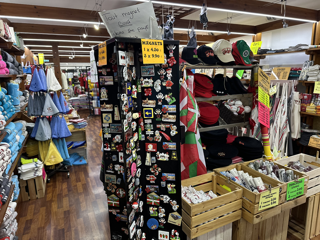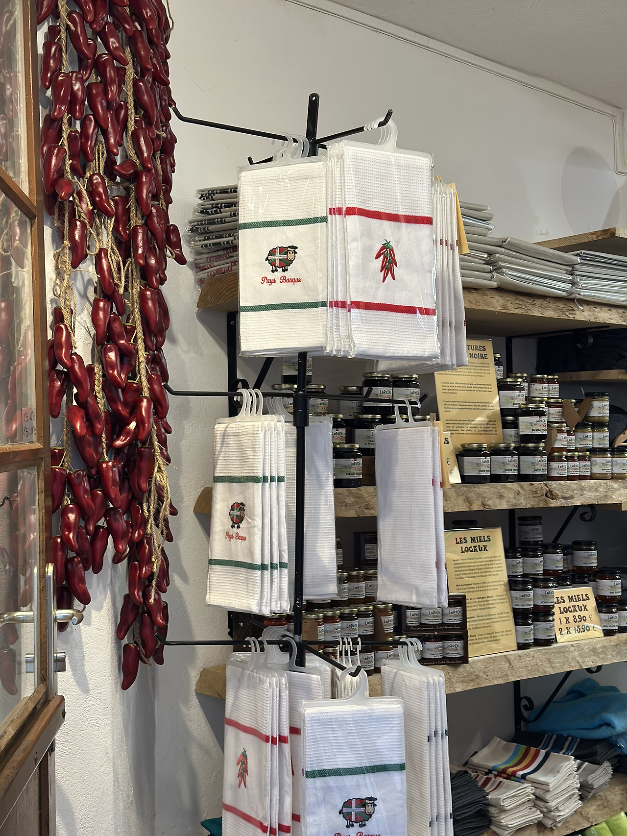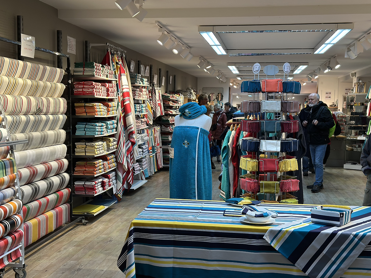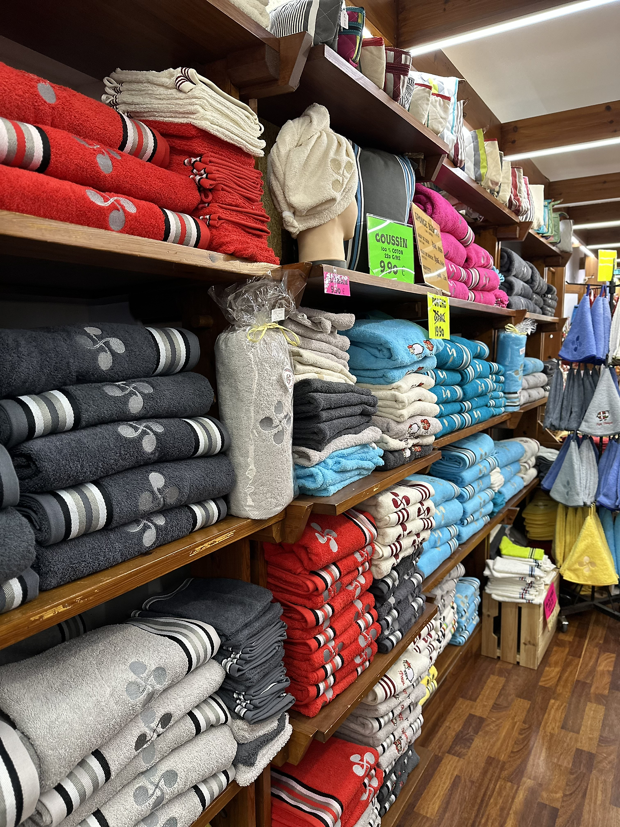 바스크 직물은 원래 농가에서 가축 덮개나 담요로 사용되던 전통 리넨 직물로, 선명한 줄무늬와 강렬한 색채 대비가 바스크 지역의 상징성을 지니게 되었다고 한다. 시간이 지나면서 재질은 면과 리넨으로 발전해 내구성과 실용성이 강화되었고, 반복 세탁에도 색상이 잘 유지되는 견고한 특성이 특징이다. 생장에서 테이블보, 주방 타월, 앞치마, 가방 등 다양한 생활용품으로 재해석된 무건들을 많이 볼 수 있는데 전통과 현대성 모두를 잡을 수 있게 잘 발전한 전통품 중 하나가 된 것이다. 빨아도 색이 잘 안 변하고 질이 유지된다는 특성이 살림하는 주부들에게 딱이라 중년의 주부 관광객들이 정말 많이 쇼핑해 가시는 걸 볼 수 있었다. 특히 타월은 가볍고 가격 부담이 적으면서도 바스크 특유의 디자인을 간직하고 있어 여행자들이 선호하는 대표 기념품이라고 하니 참고하시길 바란다.