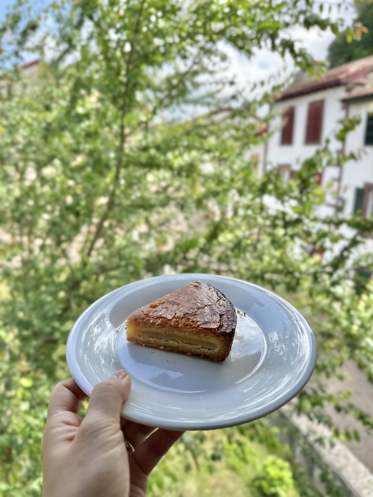 음식으로 넘어오자면 가장 유명한 바스크 케이크(Gâteau Basque)가 있겠다. 바스크 케이크는 19세기 바스크 가정에서 전해 내려온 전통 디저트로, 버터가 풍부한 반죽 사이에 체리 잼이나 커스터드 크림을 채워 구운 형태가 특징이다. 풍부한 풍미와 질감 덕분에 바스크 문화를 대표하는 후식으로 자리 잡았고 어느 레스토랑을 가도 후식 메뉴에서 찾아볼 수 있으며 생장에 있는 대부분의 빵집에서도 팔기에 손쉽게 구할 수 있다. 개인적으로 질감은 케이크와 타르트 중간처럼 부드러웠고 맛은 소박하다. 파리 같은 도시의 화려한 기교와 다양한 재료의 복잡함 없이 따뜻한 홍차와 어울릴 만한 맛 좋은 커스터드 파이라고 할 수 있겠다. 이탈리아 풀리아 지방에서 많이 먹는 파스티초또와 비슷해서 나에게는 익숙한 맛이었다. 보통 오리지널 버전으로 크림 커스터드가 들어있는 것과 체리 콩포드가 추가된 버전이 있는데 둘 다 맛있으니 생장에 있을 때 한번쯤 시도해 보시길 추천한다.