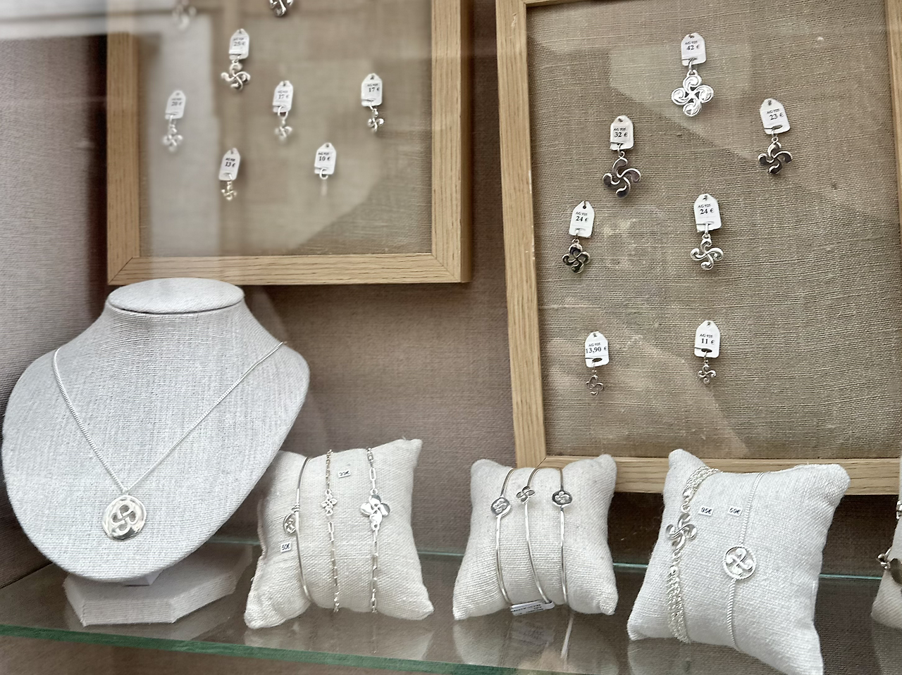 그럼 소용돌이 같이 보이기도 하고, 날개같이 보이기도 하는 바스크의 심볼 라우부루(Lauburu)는 뭘까? 라우부루는 바스크 지방을 대표하는 전통 문양으로 네 개의 곡선이 회전하는 십자 모양으로 구성되어 있으며, 바스크어에서 lau는 네, buru는 머리를 뜻한다. 따라서 라우부루는 ‘네 개의 머리’라는 의미를 가진다. 이 문양은 태양과 생명의 순환, 에너지의 흐름을 상징하는데 바스크 민족의 정체성과 단결을 드러내는 상징으로 자리 잡고 있다. 역사적으로 라우부루는 주택, 교회, 무덤 등에 새겨져 악령을 물리치고 사람을 보호하는 기능을 한다는 믿음이 있았다던데 더 나아가 네 방향(동·서·남·북)이나 네 가지 원소(불·공기·물·흙)를 나타낸다는 해석도 있다. 그러므로 라우부루는 단순한 장식을 넘어 바스크인의 뿌리와 생명력을 담고 있는 상징이라고 할 수 있다. 이렇게 알고 보니 기념품이나 주얼리 샵에서 보아왔던 물건들이 이해가 되기 시작했다.