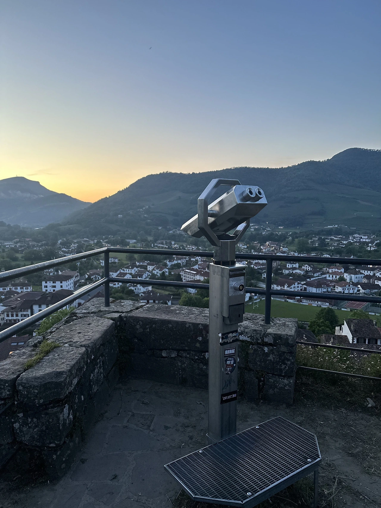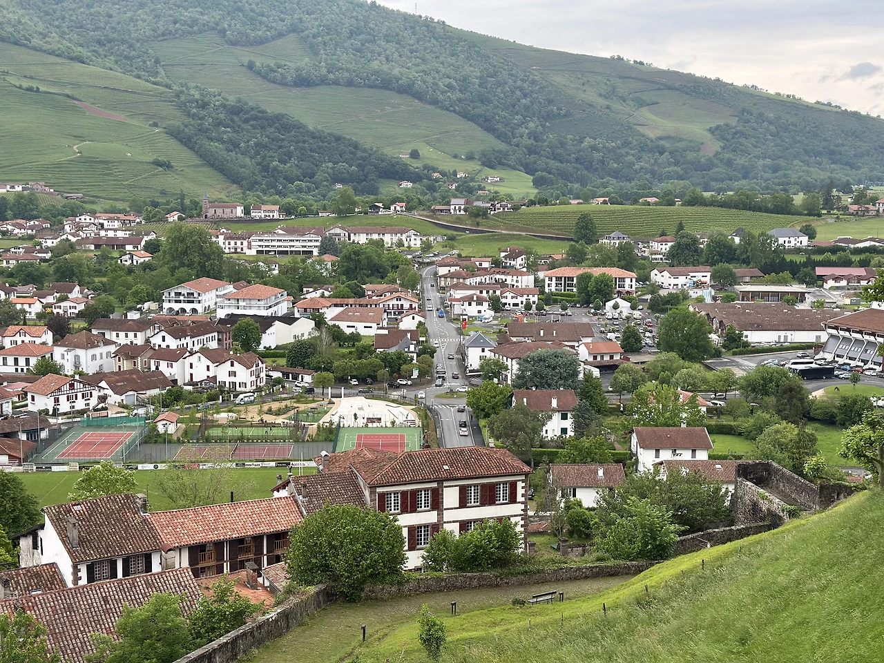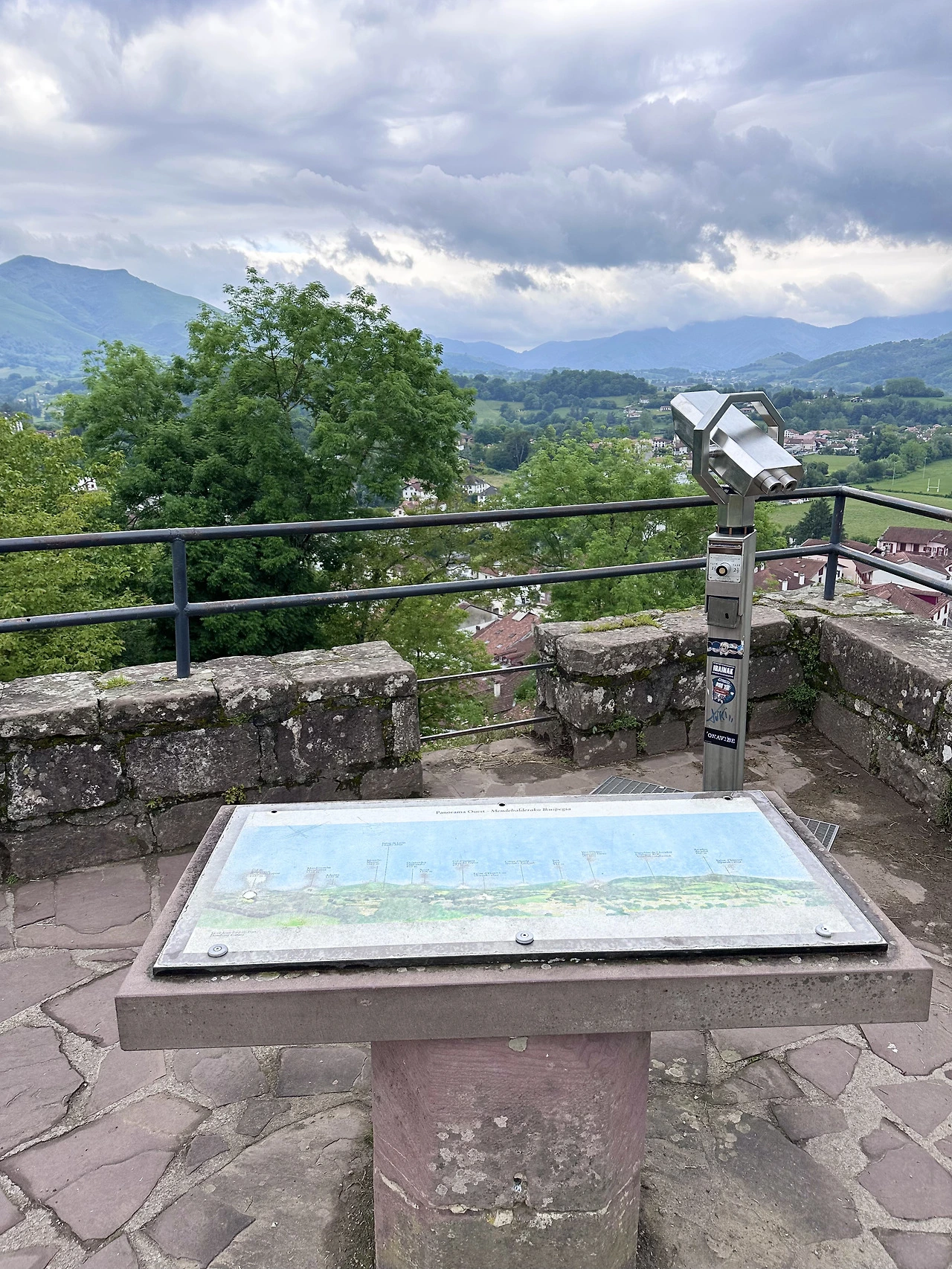 숙소로 돌아와 까르푸에서 산 물건들을 내려놓고 잠시 쉬다가 이번에는 순례자 사무실 쪽 언덕으로 올라가 보자. 지나가는 길에 순례자 사무실 안에 들려 이곳에서만 살 수 있는 프랑스 순례자 협회의 기념품들도 한번 눈여겨보고, 궁금점 같은 걸 물어보는 것도 좋다. 기념품은 줄을 안 서고 바로 들어가 마음껏 보고 나올 수 있으니 원하는 게 있다면 기억해 두었다 오후 늦게 순례자 사무실이 한가할 때 와서 빠르게 구입하는 것도 방법이다. 순례자 사무실에서 살짝 위로 올라가면 전망대라고 볼 수 있는 La Citadelle 옛 요새를 찾을 수 있는데 이번에 이쪽으로 산책을 하는 거다. 오후에 해가 중천에 있을 때가 가장 예쁘니 너무 이른 아침과 아주 늦은 저녁은 피하길 추천한다. 안전하고 한적하지만 그래도 사람이 너무 없는 시간은 지양하는 게 좋지 않겠어? 나이가 들면 들수록 안전에 더 염려를 두게 되는 게 나 아줌마는 맞는 거 같아. 여하튼 La Citadelle에서 보는 생장은 정말 아름답다. 바스크형식의 집들이 옹기종기 모여있고 온 도시가 산으로 둘러싸여 있는 게 자연 속에 숨겨진 비밀의 도시 같다는 생각도 든다. 전망대에 올라가면 이곳에서 볼 수 있는 도시들을 그려놓은 안내도가 있는데 왼쪽 저 멀리가 순례자들이 도착해야 하는 론세스바예스란다. 입구에서 바로 전망대로 올라가는 길도 있고, 쭉 돌아 요새 밑을 걸을 수 있으니 두 가지를 다 시도해도 채 40분이 안되기에 다 해보시길 추천한다.