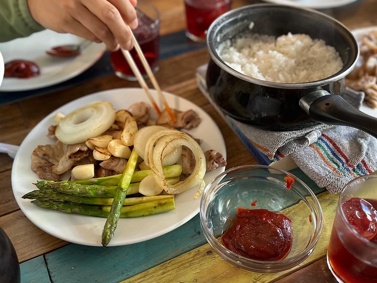 선생님은 아스파라거스에 마늘, 양파 구이에 삼겹살을 초벌까지 해가시며 정말 내가 먹은 인생 최고의 삼겹살을 구워주셨다. 어쩜 삼겹살이 이렇게 맛있을 수가 있나 싶을 정도로 다른 차원이 맛있음이었다. 고기를 구워주시는 선생님이 “신기하지 않아? 여기 스페인 삼겹살은 고기 굽는 냄새가 안 나네?" 하시길래 생각해 보니 이미 머리카락 깊이 배어있어야 할 고기 냄새가 한참을 부엌 안에 있었는데도 없었다. 오~ 이거 우리만 그런지 모르겠는데 앞으로 산티아고 순례길 걸으시면서 고기 구워 드시는 분들도 꼭 확인해 보셨으면 좋겠다. 신기해.