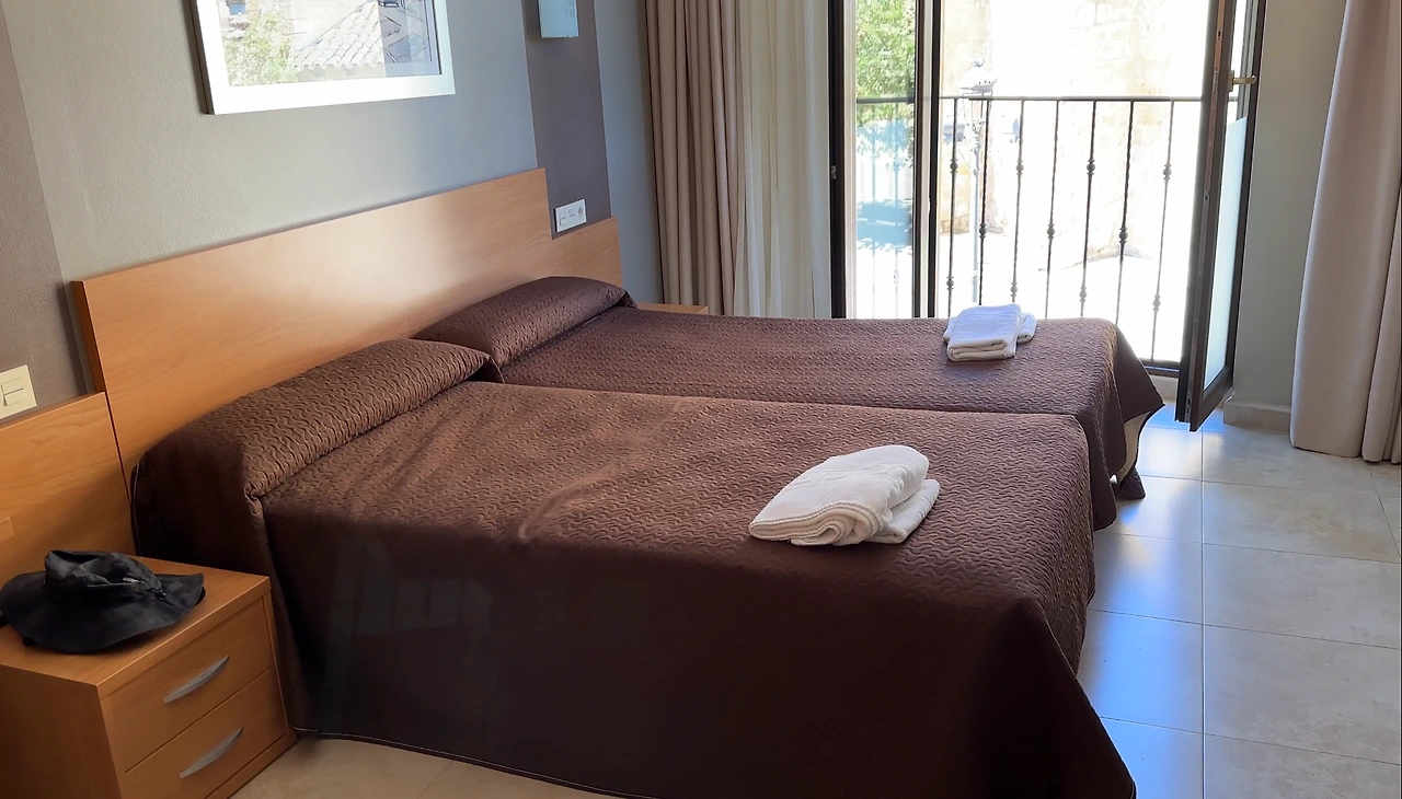 나의 경험 : 커다란 통창 밖으로 빛이 들어오고 성당을 내다보는 건 너무 좋은데 시설이 전체적으로 올드하다. 오래된 가구들과 오래된 침대 시트의 꿉꿉함이 있었다. 형광등 하나가 소리를 내며 깜빡거리는데 귀찮아서 바꿔달라고는 안 했다. 순례길 31일 중 가격으로 치면 상위 5위로 비싼 곳이었는데 그 값을 못해서 아쉽다.