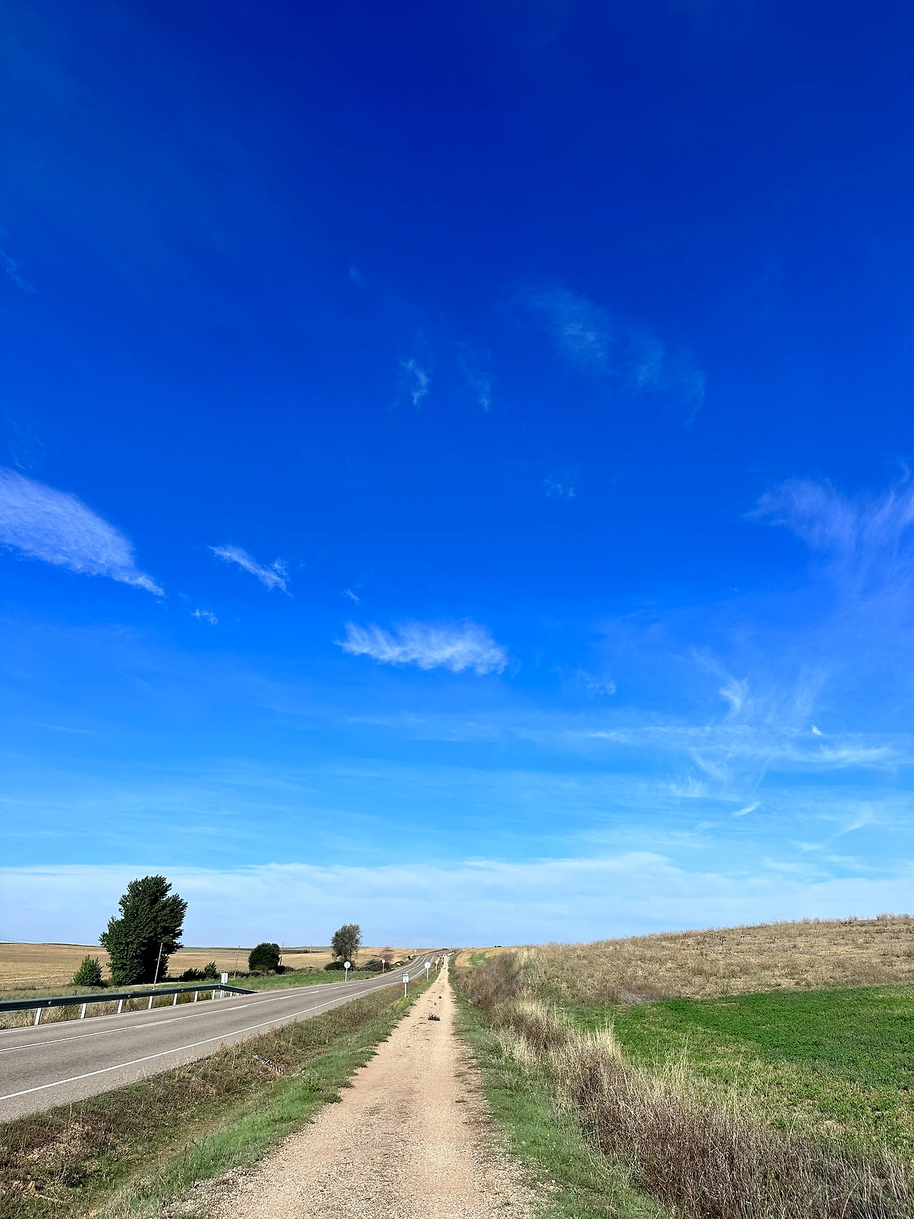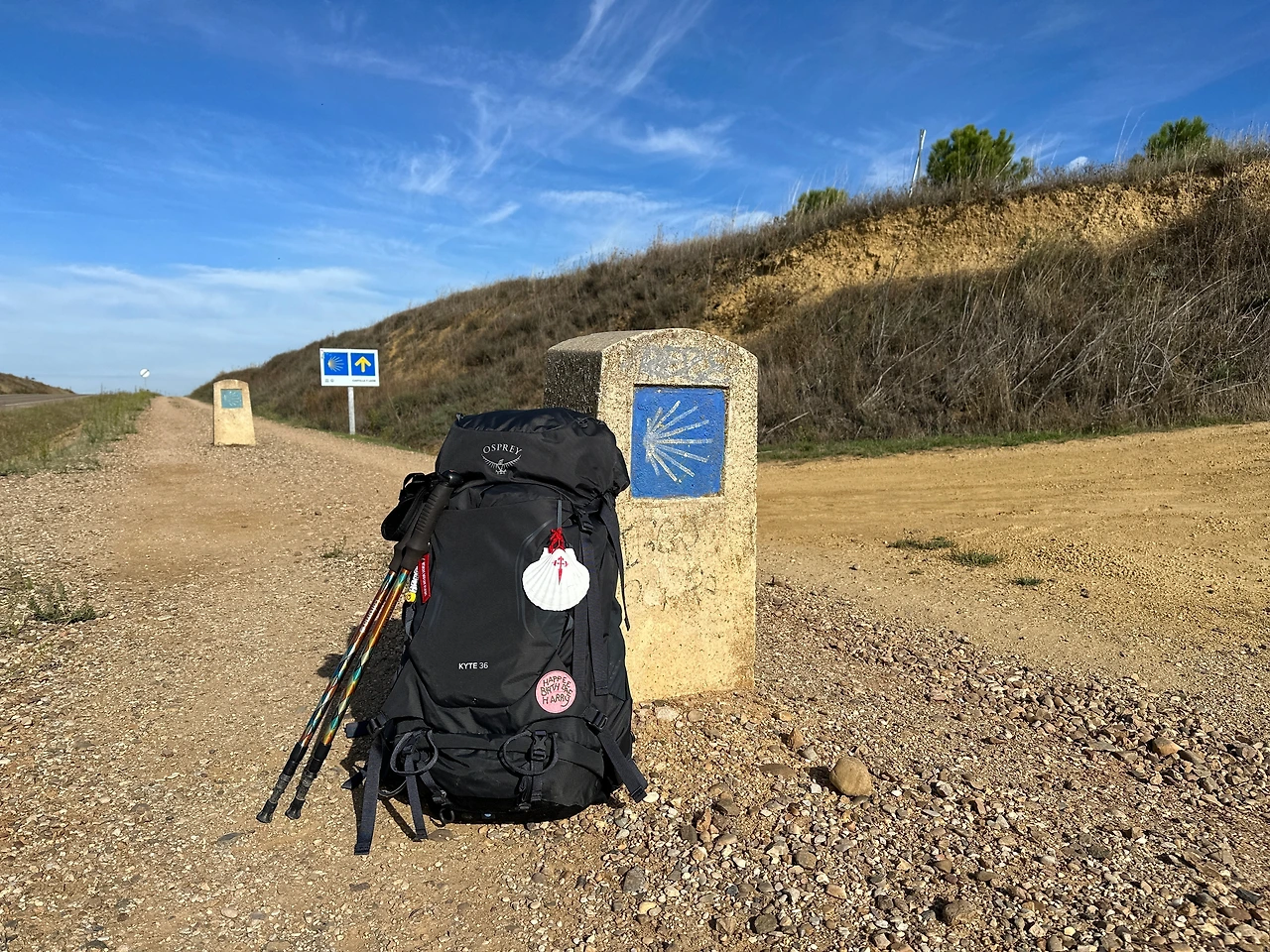 하늘에 구름 한 점 없이 맑은 날이다. 걷는 길도 일직선이고, 날씨도 밝고 맑고 아주 건조한 게 기분까지 뽀송하다. 너무 기분이 좋아 가방을 내려놓고 비석옆에 세워 설정 샷도 한번 찍어본다. 블로그에 숱한 남들의 산티아고 후기에는 예쁜 사진이 넘쳐나던데 이런 사진을 찍을 여유가 대체 어디서 나는지 그 사람들이 신기하다. 나는 걸으면서 사진까지 찍을 여유가 별로 없던데 말이야. 세상에 순례길을 영상으로 담은 유투버들은 어디에서 그 여유와 멀티태스킹이 되는 힘이 나는 건지 경이롭기까지 하다. 나는 가방사진 하나 찍느라 한 5분 소요하니 진이 빠지고 무엇보다 가던 길을 멈추고 내 흐름을 끊는 게 참 힘들다. 나는 그냥 잘 걷기만 해야겠다. 오늘같이 걷는 거리도 짧고, 날씨가 너무 좋고, 주위에 사람 없을 때 아주 가끔 기분이나 내고 추억이나 만들자 하고 사진 찍는 건 앞으로도 드물 것 같다. 자, 가던 길이나 가봅시다.