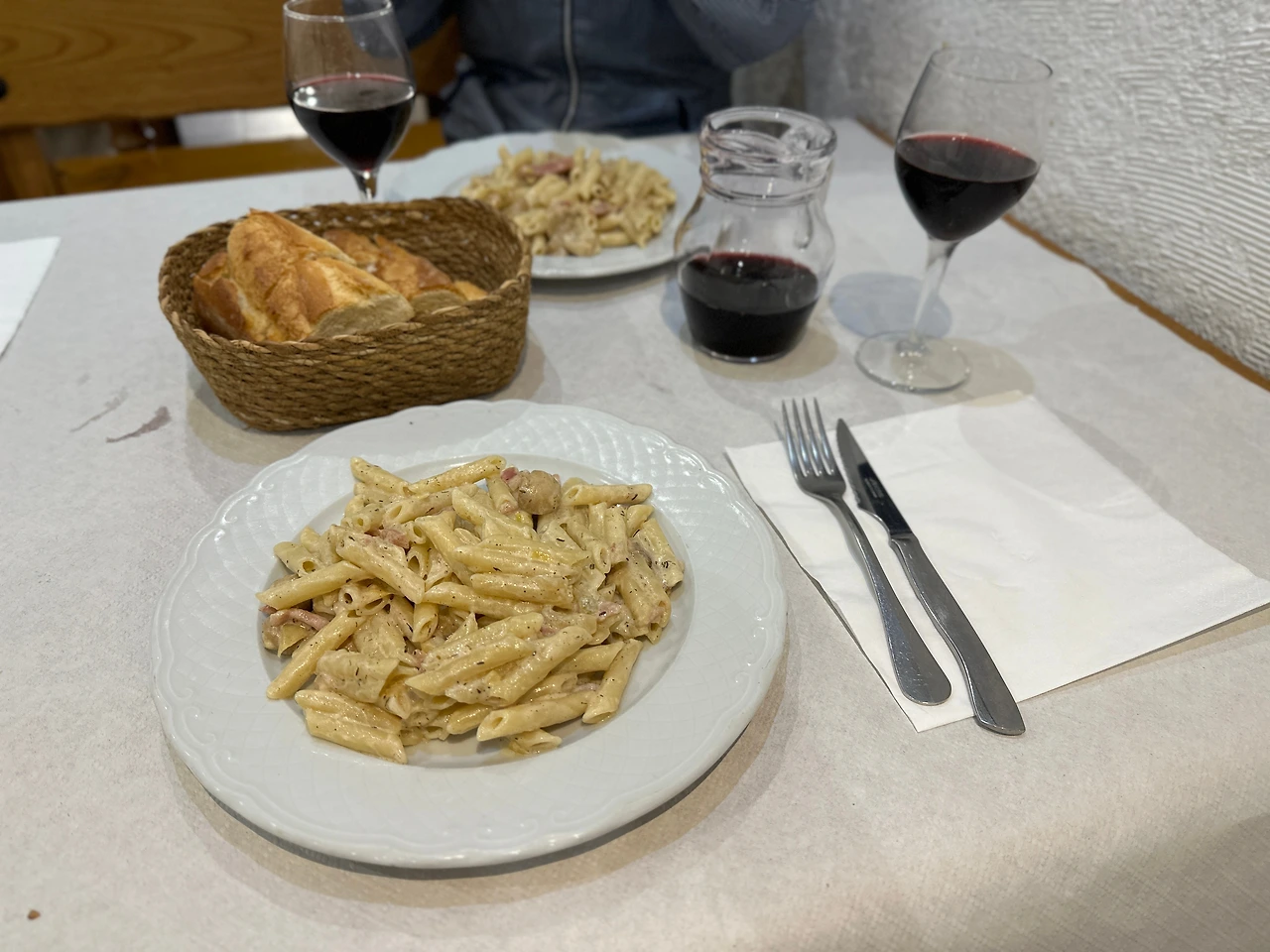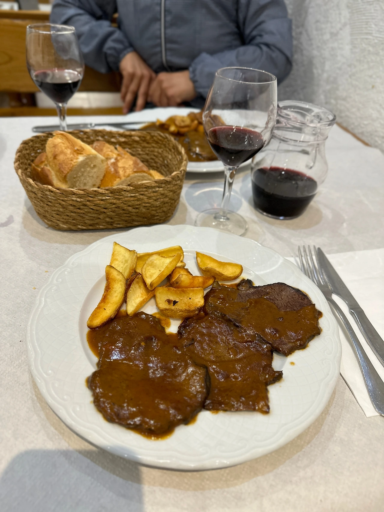 첫 코스는 한 명이 다 먹을 수 없을 정도의 수북한 양의 까르보나라 파스타가 나왔고 맛은 특별할 것 없었지만 무난하게 고픈 배를 채울 수 있는 좋은 메뉴였다. 두 번째 코스로는 소고기와 감자튀김이, 마지막 코스 디저트는 초콜릿케이크까지 14유로 치고는 부족하다고 할 것 없는 식사였다. 음식이야 어떻건 오늘은 호주 아주머니와 함께해서 더 즐거웠다. 독실한 가톨릭신자이신 아주머니는 늘 미사를 보러 도착하는 동네의 성당에 가신다고 한다. 이 산티아고 순례길도 카톨릭 신자로서 성스러운 길을 순례하고 싶어 혼자 오셨으니 나이와 불편한 몸의 한계를 넘어 사람을 움직이게 하는 종교의 대단함을 느낀다.