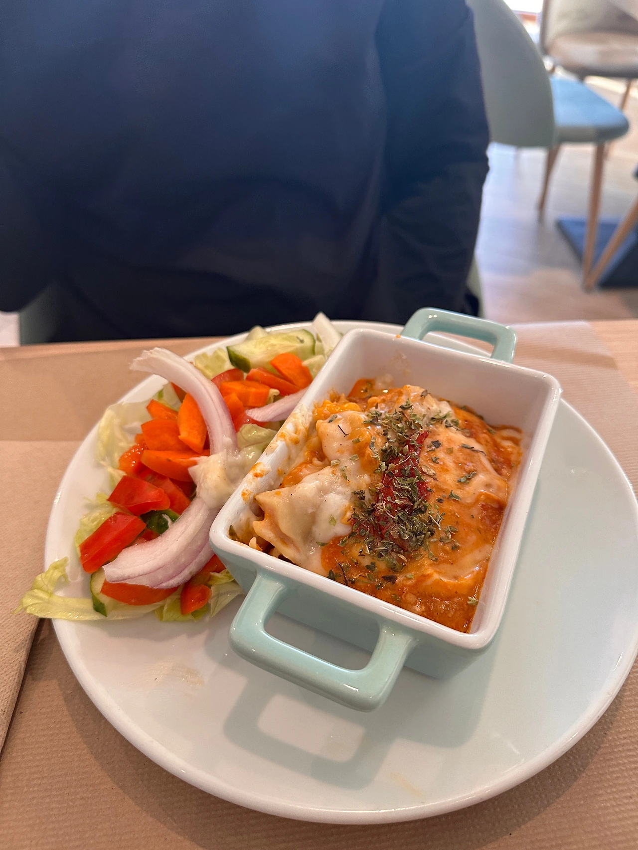 "와~ 음식을 첫 코스, 두 번째 코스, 디저트까지 고를 수 있고 양도 많고 맛있다야. 이 정도면 하루에 한 끼 제대로 먹고 나름 좋은데? 나 때는 이런 것도 있는지 몰랐어. 너무 좋다야."