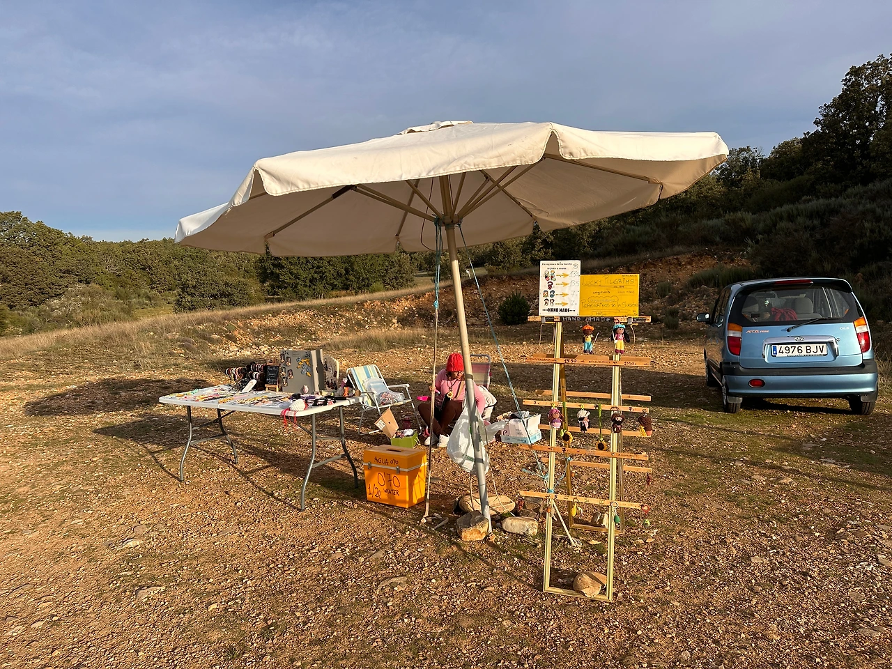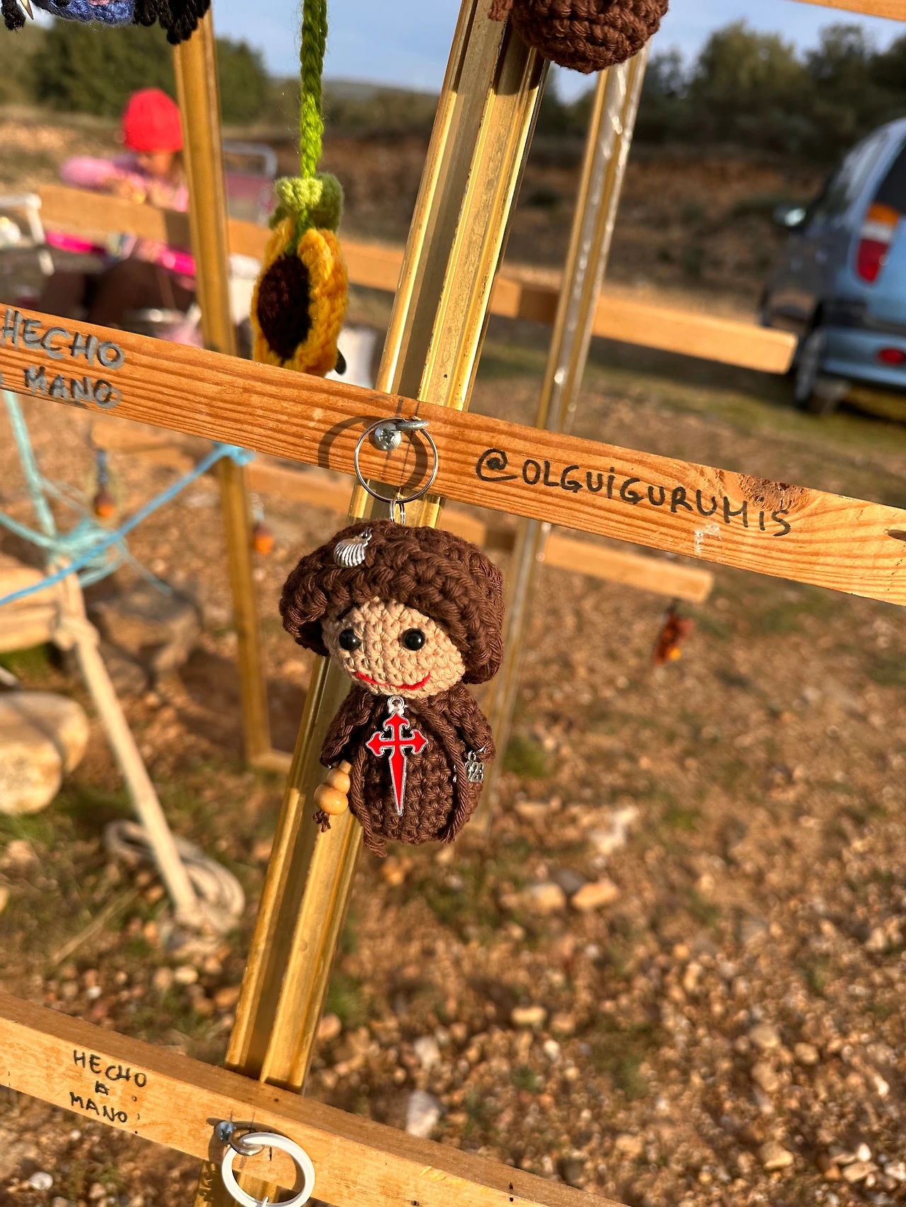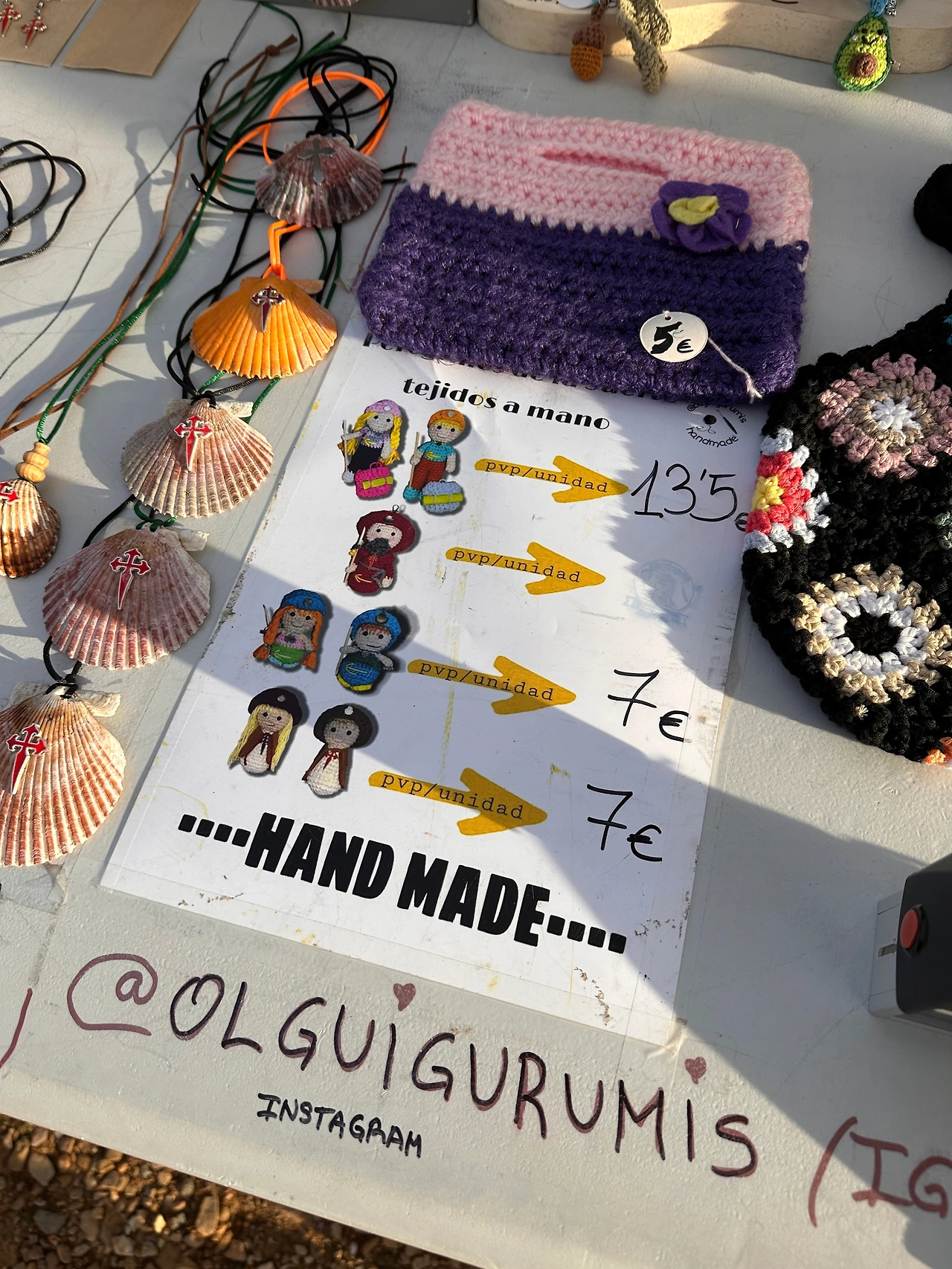 걸어가는 길에 작은 손뜨개 인형을 파는 작은 가판을 만났다. 길에서 조금 안쪽으로 있어서 시간을 내어 다가가는 사람 이외엔 모든 사람들이 그냥 지나갈 것 같았다. 하지만 나는 기념품의 노예가 아닌가. 이곳에서 귀여운 순례자모양의 뜨개질 인형을 만지작거리니 언니가 사줬다. 참이 4개나 달려있는데 2023년이라고 달린 참이 올해 순례길을 기억하기에 딱 좋은 것 같았다. 언니가 예쁘다고 한 나무로 만들어진 노랑색 조개도 하나씩 사본다. 이제부터 사는 기념품들은 훗날 언니와 함께했던 길을 기억할 수 있는 더 색다른 매개체가 되어줄 것 같아 의미가 남다르다.
