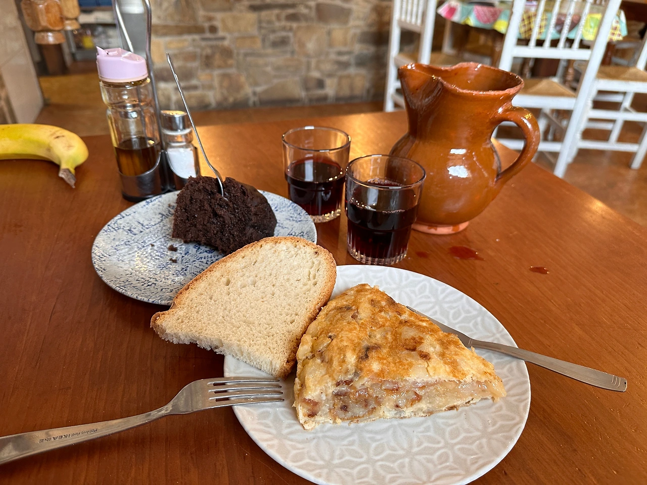 처음에는 이제 한 시간 정도만 걸으면 도착인데 뭔 술을 마신다는 건가 하다가도 언니가 마시고 싶다니 같이 시켰다. 둘 다 워낙에 상그리아를 좋아하기도 하지만 그냥 오늘은 부상에도 열심히 걸어준 언니가 하고 싶은 거 다 들어주고 싶은 마음이 더 컸다. 간간한 또르띠아 하나에 달달한 초콜릿케이크까지 하나 시켜 그렇게 상그리아를 마시기 시작했다.