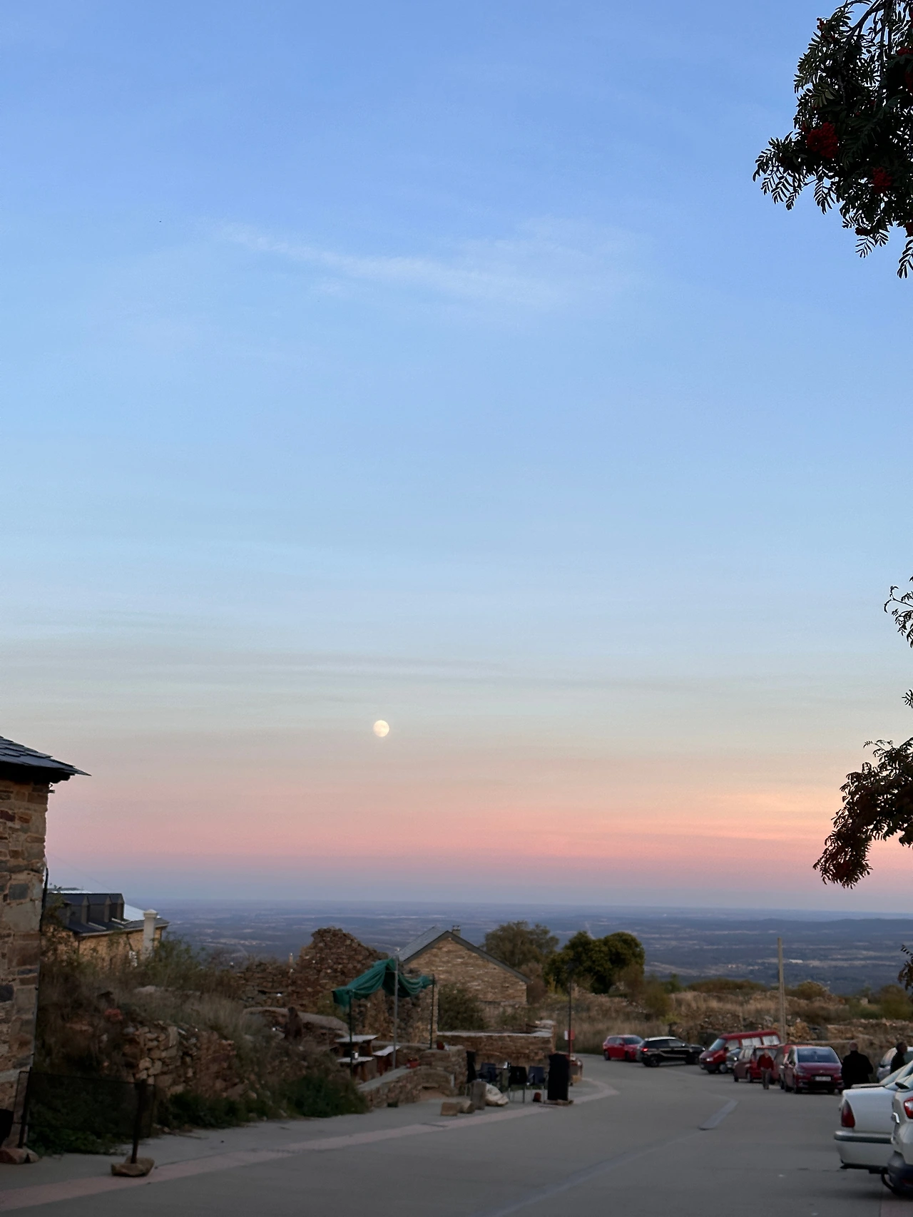 오늘은 겨우 21km (이제 20km 정도면 겨우라는 말이 나오다니 너무 웃기다)를 걷는 날이라 4시간 반 정도면 도착하겠지 하며 마음부터가 가벼웠다. 이렇게 새벽 6시 반 오늘의 일정을 시작할 때는 참 좋았지. 어둑어둑하지만 머물렀던 숙소 바로 앞이 순례길 시작하는 지점이라 처음으로 여정표를 찾아 두리번거리지 않고 일직선을 향해 신나게 걸었다. 한 시간쯤 지났을까. 어제 보았던 그 환상적인 일출이 다시 시작되었고, 언니와 함께 10여 분간 사진을 찍고 영상을 찍으며 높은 빌딩 하나 없는 평지 위의 넓은 하늘을 쳐다보며 이순간을 즐겼다.