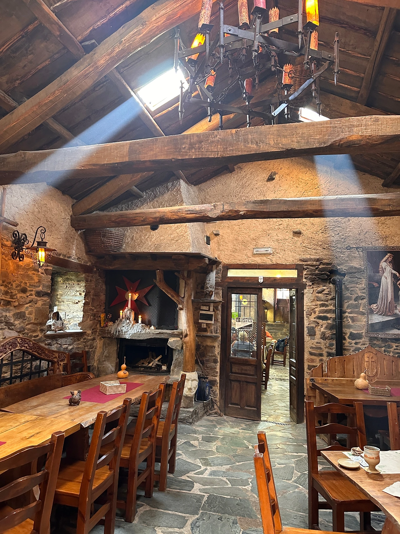 다리 아픈 언니가 정말 열심히 걸어줘서 5시간 45분 만에 폰체바돈에 도착했다. 잘 도착했으니 이제 밥 먹으러 가야지! 오늘의 점심은 구글 평점 4.5의 중세시대 컨셉의 La Taberna de Gaia에서 호박수프와 돼지갈비를 먹었다. 모든 스태프들이 중세시대 주막 스타일의 가죽 덧대어진 옷을 입고, 술잔도 고블렛잔에 컨셉에 충실한게 참 재밌는 곳이다. 돼지갈비는 포크립이랑 비슷했는데 소스 없이 구운 고기 본연의 맛인게 참 좋았다.