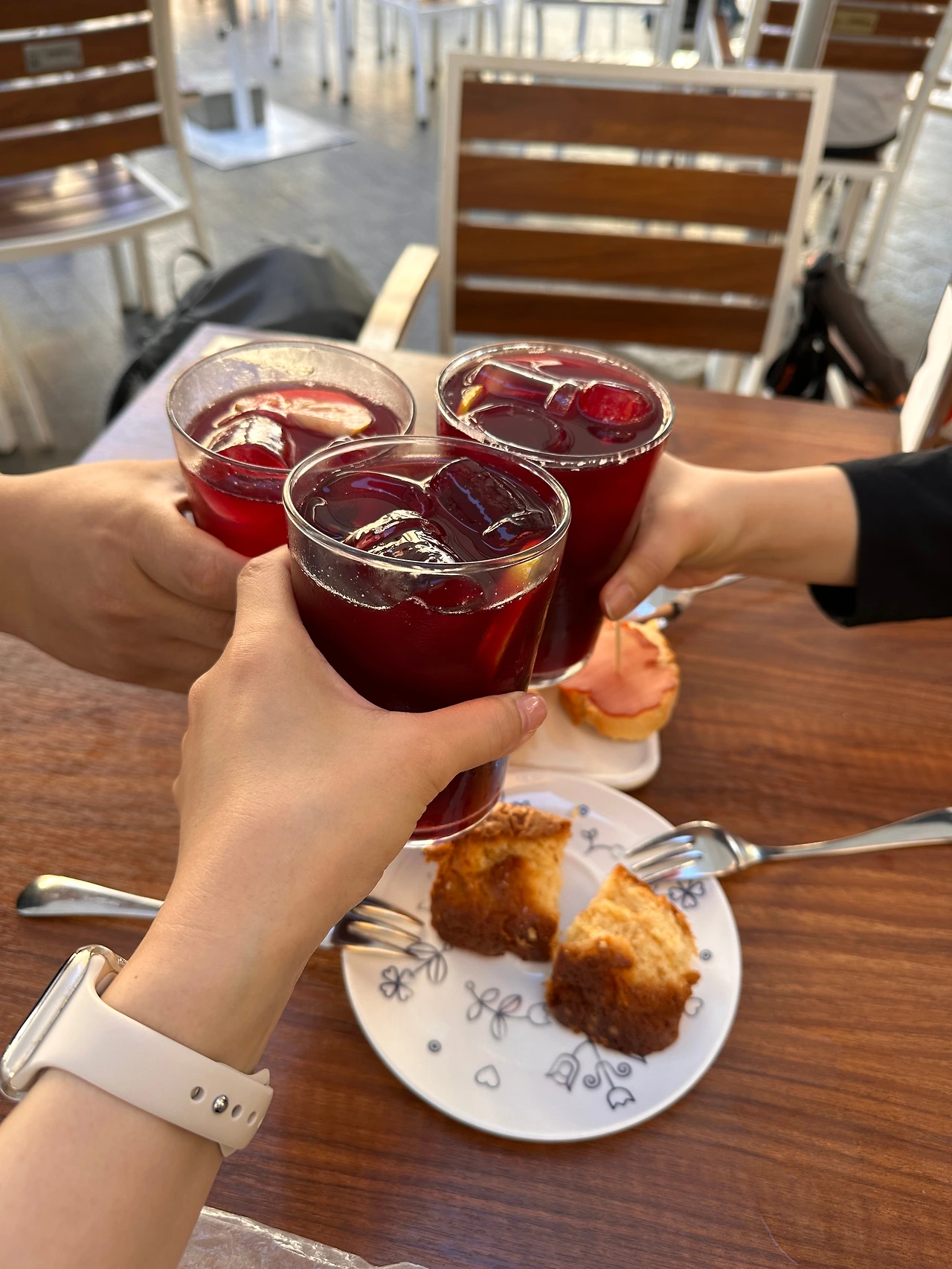 너무 반가워서 달려갔다. 어제 이후로 다시 못 볼 것 같았는데 인연이 있는지 여기서 또 만난다. 알고 보니 어제 J 씨가 내일 몇 시에 출발하냐고 물었을 때 우리가 5시쯤 갈 것 같아요 한 걸 기억하고 일부러 본인도 5시에 일정을 시작한게 아닌가. 아고... 우리 15분 늦게 출발했는데 연락해서 같이 갔었으면 좋았을 것을 우리한테 부담 될까봐 그냥 혼자 걸어온 거다. 그래도 여기에서라도 만난게 어딘가. J 씨는 오늘 이곳 빌라 프랑카까지만 걷기 때문에 일정이 다 끝났단다. 아쉬우니 다 같이 앉아 띤또 데 베라노를 한잔 하기로 했다. 광장에 보이는 바 중에 J 씨가 얼른 서칭을 해서 나름 평점 좋은 곳의 야외에 자리를 잡았다.