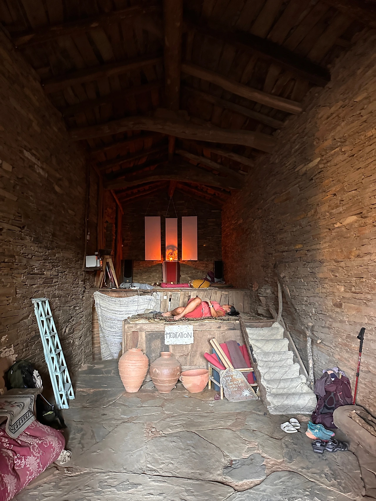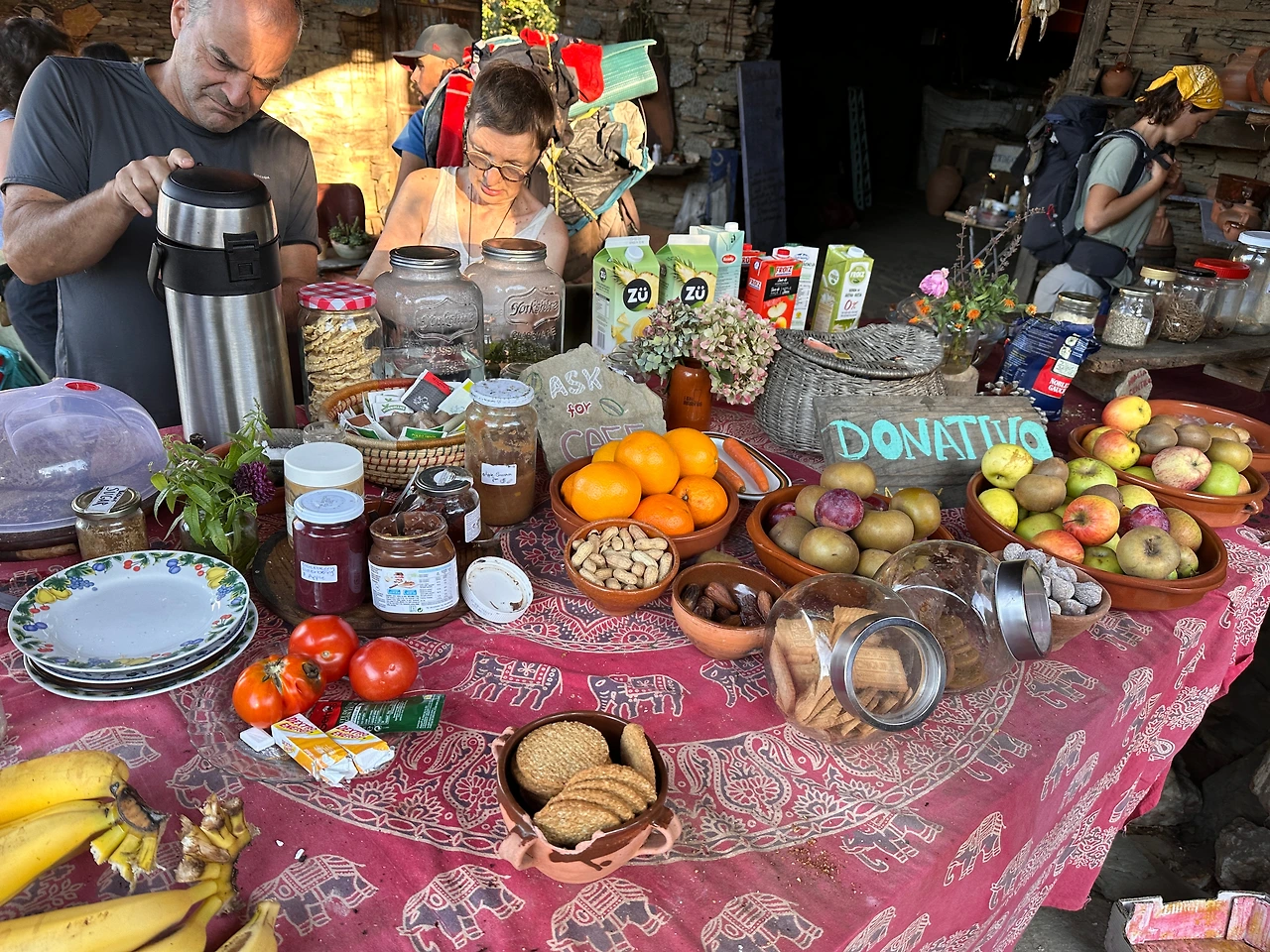 4시간쯤 걸어 우연하게 마주친 도네이션 바 테라 데 루즈. 여기는 히피 분위기가 정말 만연한 또 다르 세상이었다. 5일 전에 만났던 탁 트인 광경의 최고의 도네이션 바 라 카사 데 로스 디아세스와 비교하면 여긴 집 안처럼 반 실내에 꾸며진 곳이랄까. 가방에 달 수 있는 조개를 꾸미는 스탠드도 있고, 말린 허브들을 담아갈 수 있는 곳, 명상과 요가를 할 수 있는 장소가 모두에게 열려있었다. 음식은 많지 않았지만 곳곳에 의자들도 많이 마련돼있고 사람들이 오랫동안 쉬어가며 서로를 알아가는 시간을 갖고 있었다. 실은 카페인 줄 알고 언니와 들어갔지 도네이션 바인 줄은 상상도 못했다.