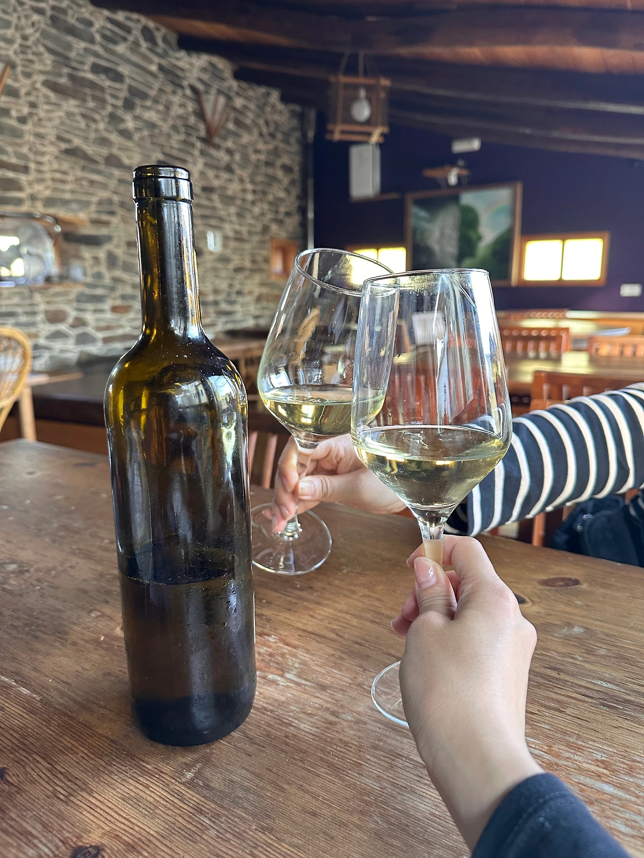 숙소에 돌아와 씻고 한참을 쉬다가 이제는 저녁을 먹으러 다시 시내로 나가봤다. 순례길에서의 일정은 걷고 먹고 쉬고를 반복하는 단순하게 그지없는 루틴이지만 오늘 사리아라는 도시 자체가 규모가 있는 모던한 곳이라 돌아다니는 재미가 있었다. 나는 뜬금없이 치즈케이크가 먹고 싶어져 근처에 식사도 할 수 있으면서 디저트 메뉴에 치즈케이크가 있는 곳을 찾아 A traversia dos Sonos에 갔다. 작은 입구와는 다르게 홀 하나를 지나면 널찍한 정원에 1, 2층으로 밖을 내다볼 수 있는 넓은 공간이 있어 2층에 자리 잡았다. 아직 6시쯤 이른 저녁이라 주방을 안 열었다고 기다리라고 해서 와인 리스트 먼저 받아 훑어 보기로 했다.