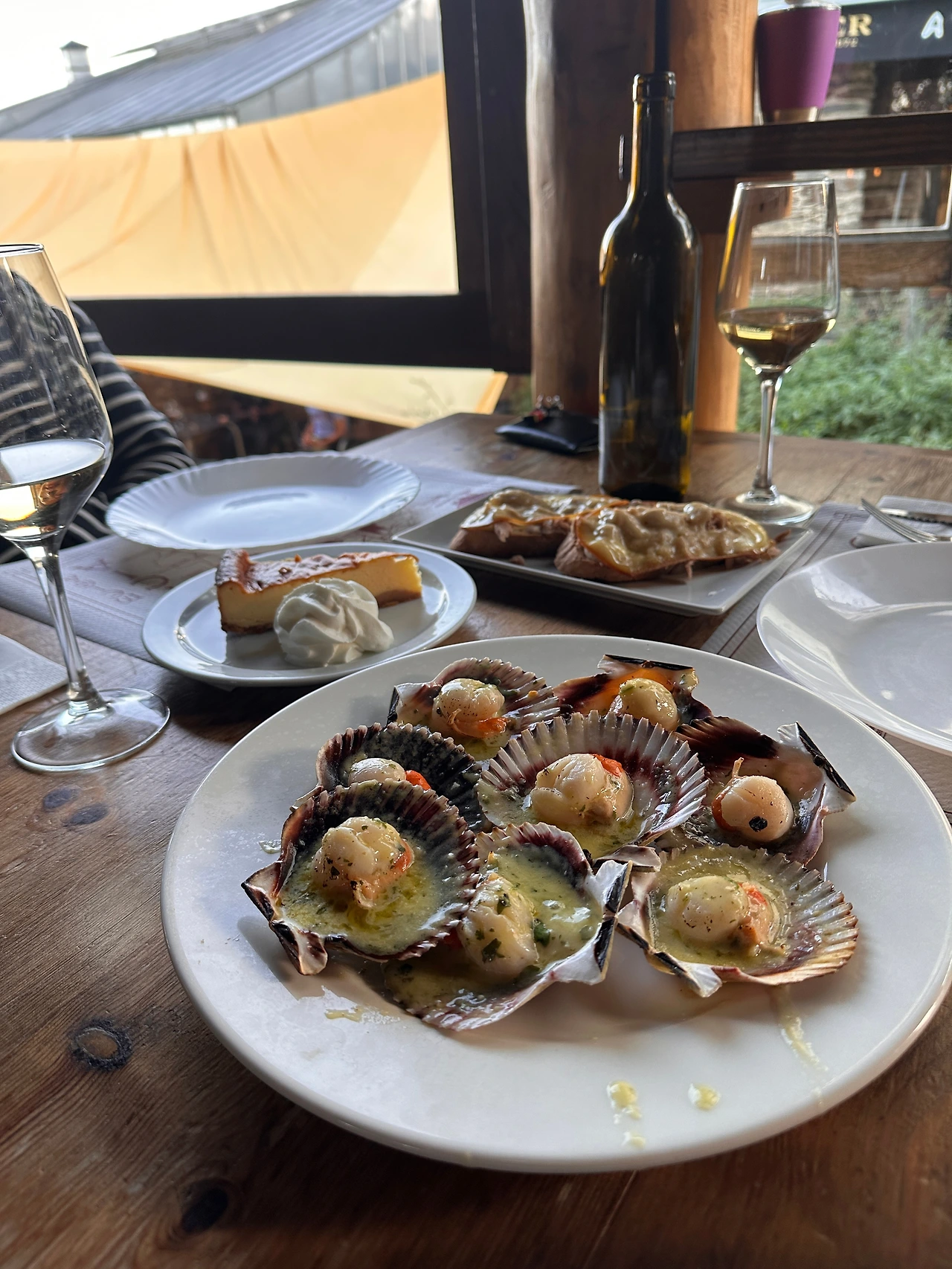 언니와 함께 와인 한 병을 깔깔대며 다 비웠다. 중간에 우리가 시킨 가리비 요리와 치즈멜티드 토스트도 나왔고, 내가 먹고 싶었던 치즈케이크도 맛있었다. 우리가 자리 잡은 2층에 아무도 안 올라와서 홀 전체를 전세 낸 듯이 둘만의 세상에 있는 것 같아 편하고 좋았다. 7시가 지난 시간이지만 아직도 따뜻하게 내리쬐는 해가 나긋한게 정말 행복한 순간이었다. 언니가 자기는 순례길을 걸으며 이리 7~8시에 술 마시고 돌아다닌 기억이 없다고 한다. 저녁에 밖에 나와 다른 레스토랑에서 와인 한잔 기울이거나, 좋은 메뉴를 시켜본다거나 이런 현지인 같은 경험을 못해봤다고 지금 참 행복하다고 한다. 늘 걷는 일정을 마치고 숙소에서 저녁을 마치고 나면 자기 바빴는데 이렇게 길어진 해를 벗 삼아 좋은 음식, 좋은 술을 해가며 우리 둘이 스페인에 함께 있다는게 신기하단다. 언니와 와인, 음식들, 뒷배경을 뇌리에 남게 멘탈 픽처를 찍어본다. 큰 공간에 우리 둘이랑 햇볕만 가득했던 2023년 10월의 첫째 날 산티아고의 사리아. 오래 기억에 남기고 싶은 참 평화로운 순간이다.