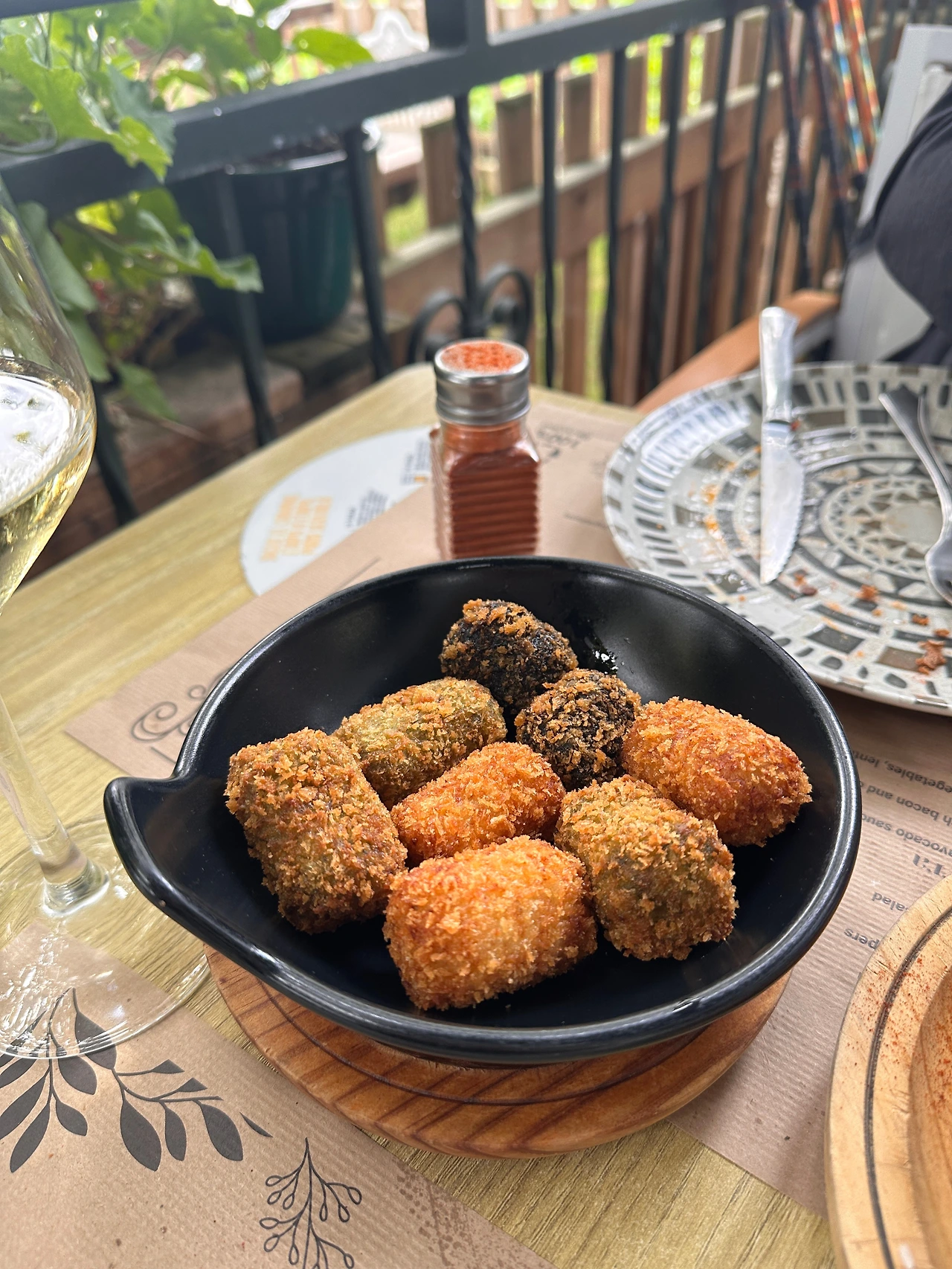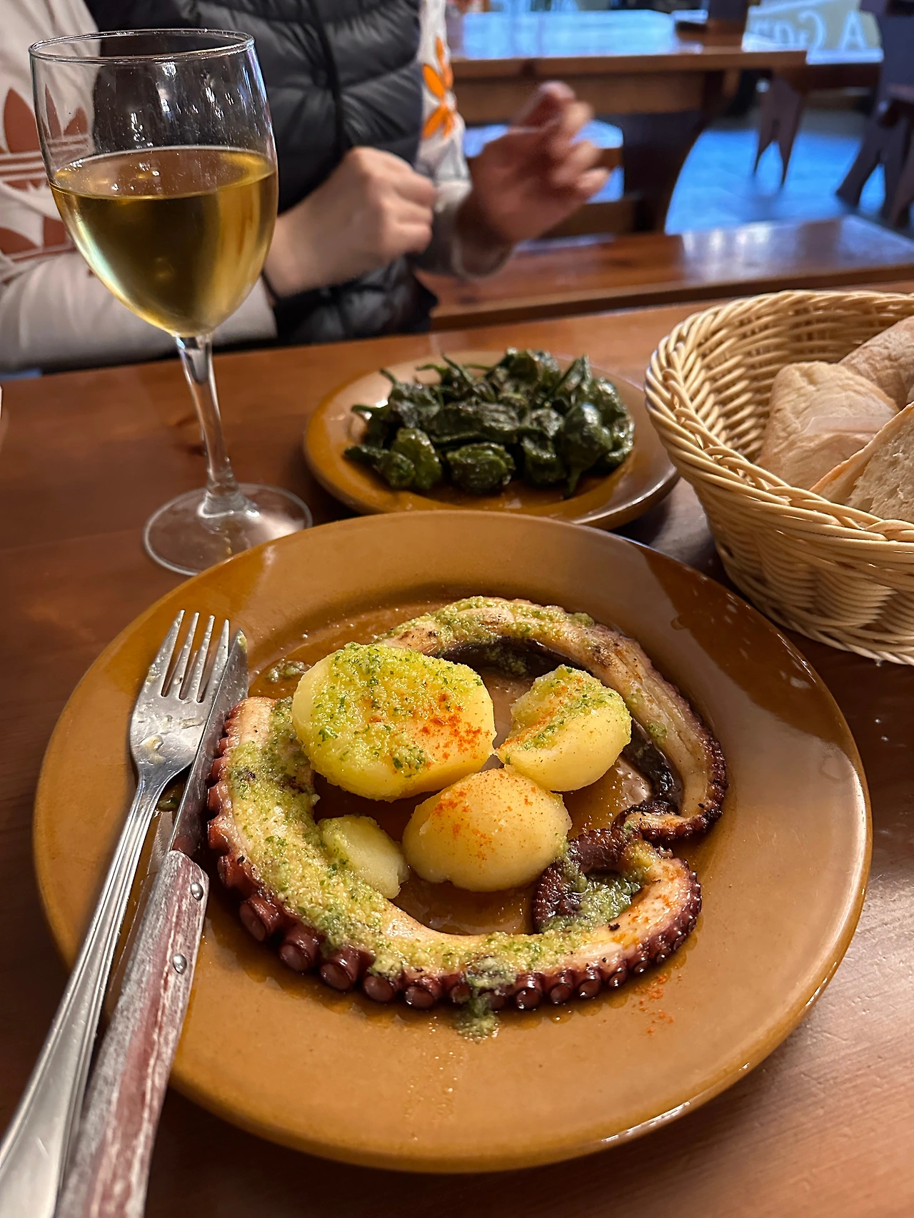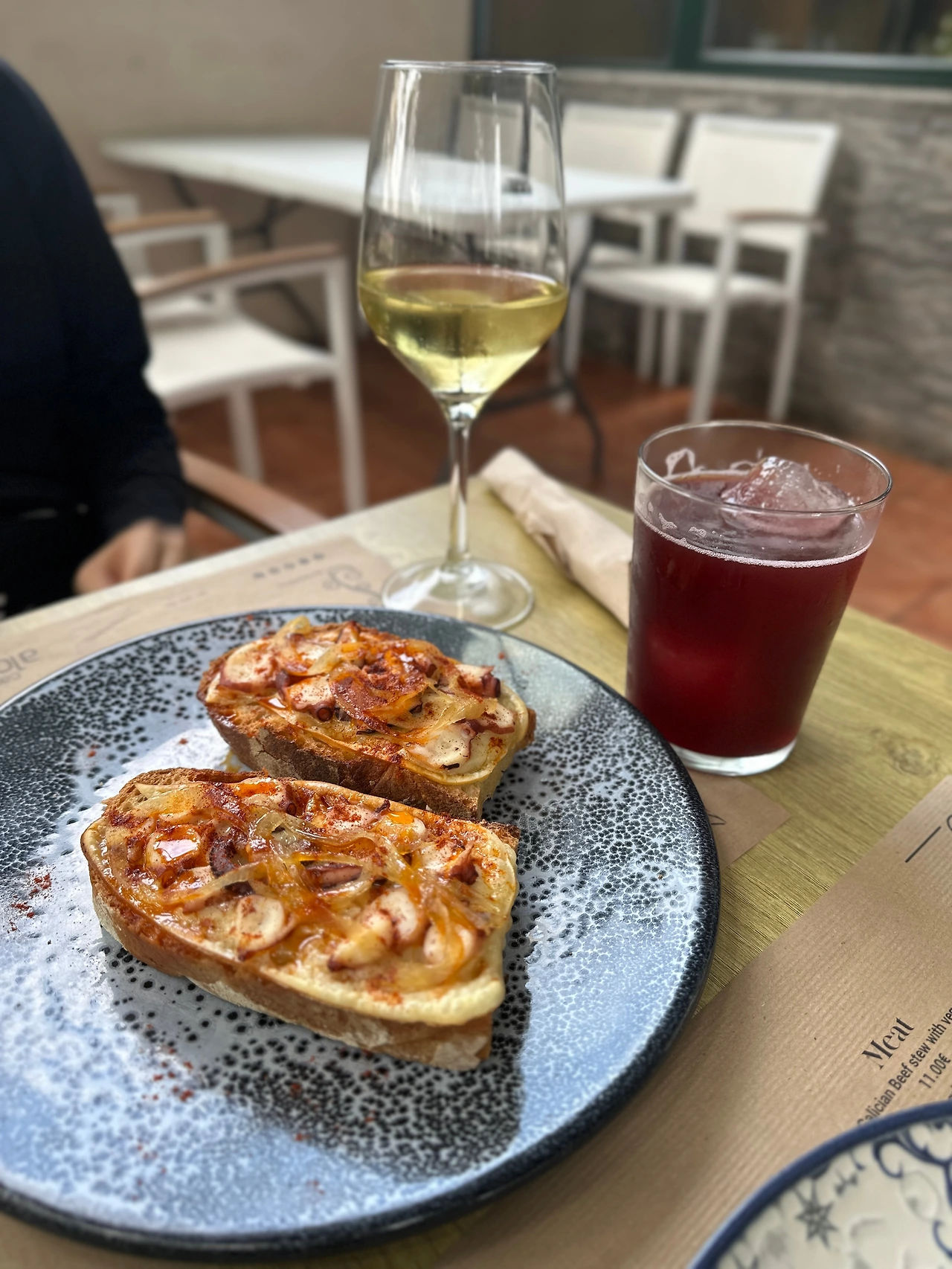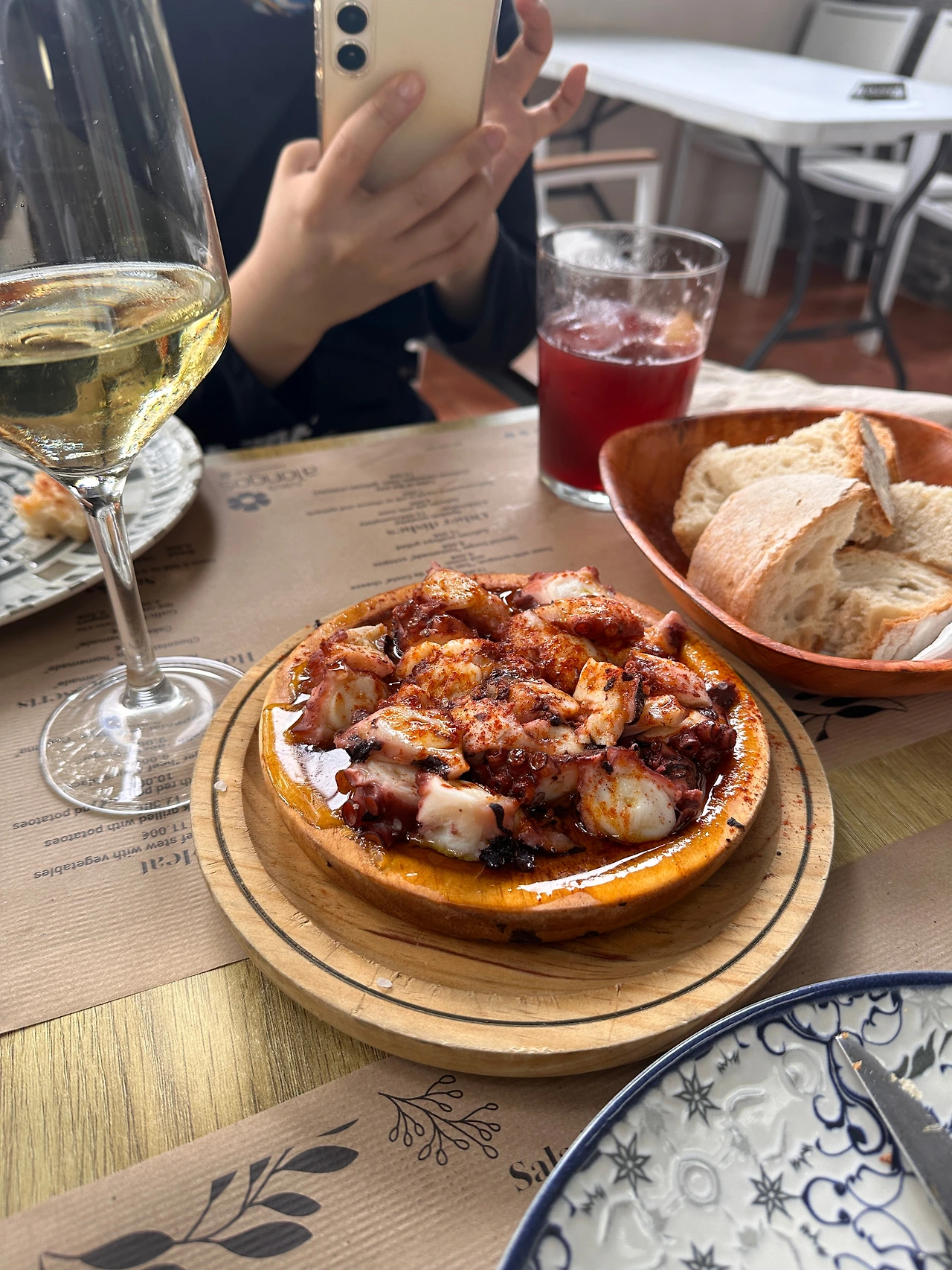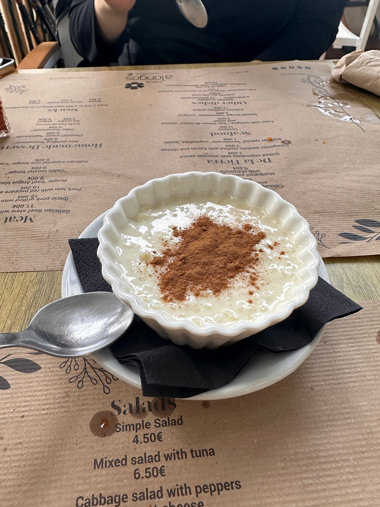 멜리데에 도착했다. 숙소로 도착하기 전에 아예 바로 문어를 파는 뽈페리아로 직행했다. 둘 다 배가 고파서 구글 평점 4.7의 Casa alongos에서 정말 만족한 식사를 했다. 우리 둘 다 해산물보다는 고기파라서 문어도 그냥 있으면 먹지 찾아가서 먹는 타입은 아님을 미리 말하지만 그런 우리 둘이 내일 당장 엄마 아빠 모셔와서 먹여드리고 싶다고 생각하게 만든 곳이었다. 바로 문어 한 접시를 시키기는 좀 안내켜서 (둘 다 해산물 그리 안 좋아함) 간단하게 문어가 올라간 토스트를 시키고 술을 한잔씩 하다가 문어가 좀 얇은 것 같아 결국에는 가장 많이 먹는 삶은 문어를 시켰다. 그리고는 "와~ 대박이다. 를 외치며 먹게 되었다지. 같이 시킨 화이트 와인도 맛있었고, 언니는 크로켓이 먹고 싶다고 믹스로 된 것을 시켰는데 대구맛, 시금치+치즈 맛, 오징어 먹물 맛 3가지가 다양하게 나와 정말 맛있게 먹었다. 둘 다 여기 음식이 너무 괜찮은 것 같다고 디저트도 맛있을 것 같아 내친김에 후식으로 쌀푸딩과 초콜릿 크림도 시켜 먹었다. 주문받는 아주머니도 밝고 친절하시고 전체적인 바이브가 참 따뜻했다. 아 정말 부모님 멜리데에 모셔오고 싶었다.