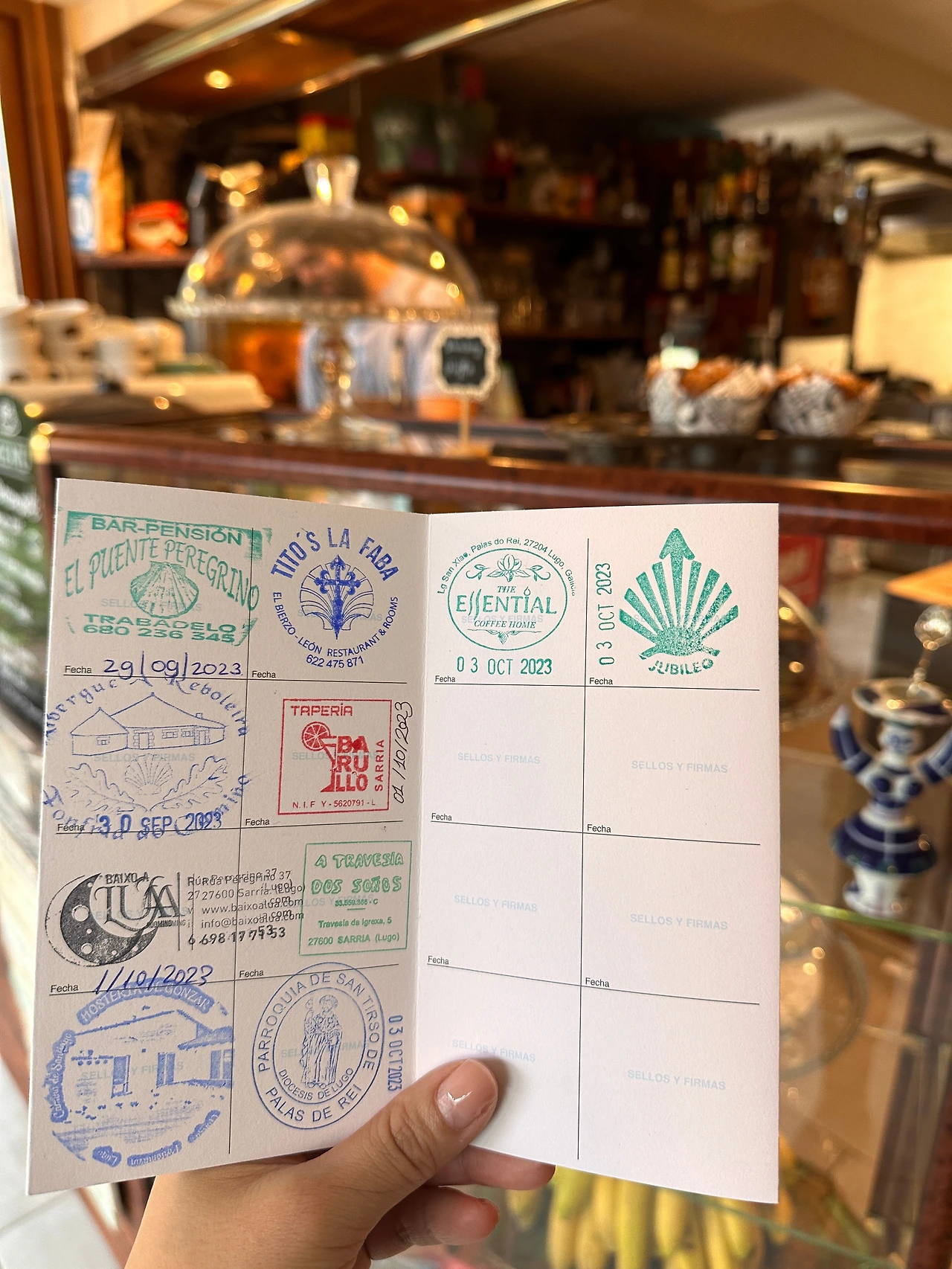 이곳에서 순례자 여권에 세요를 찍으려고 보니 도장이 2개다. 하나는 에센셜 카페 이름이 적혀있는 보통의 세요고, 하나는 순례자를 상징하는 조개 무늬에 Jubileo라고만 적혀있다. 뜻이 궁금해서 주인아저씨께 물어보니