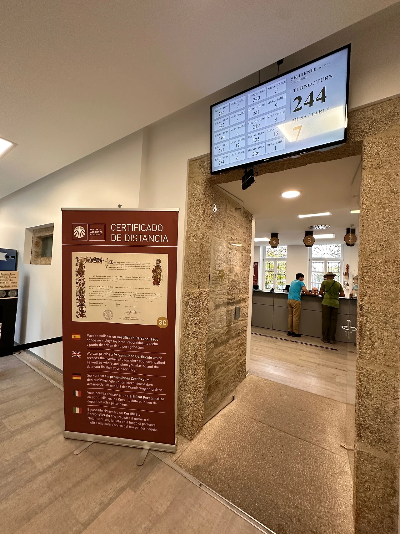 드디어 순례 완료증을 받았다. 들어가기 전에 QR코드 설문으로 내가 걸은 구간과 날짜, 이름 등 간단한 정보들을 적어 접수한 뒤 안내요원에게 보여주고 입장하면 10분 안팎으로 완료증을 받을 수 있었다. 완주했다는 증명서는 무료로 제공해 주고, km 거리가 자세하게 적힌 증명서는 2유로인가 3유로인가 조금의 비용을 내고 받을 수 있어서 우리는 둘 다 발급받았다. 이제 공적으로 나는 산티아고를 완주한 순례자인 거다.