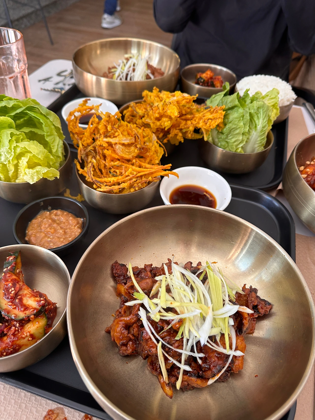 누마루는 산티아고 대성당에서 15분 정도의 위치에 있는데 이제 걷기 15분 하면 콧웃음이 쳐질 정도로 가소로운 거리가 된 거, 바로 이게 산티아고 순례길을 갖 완주한 자의 여유 아니겠나! 남동생이 누나들 열심히 잘 걸은 걸 축하하며 맛있는 밥 한 끼 거하게 사드시라고 용돈을 준다길래 동생 덕에 양념치킨도 시키고 나는 제육볶음, 언니는 갈비를 시켰다. 와 이거 너무 다 내 스타일이라서 정말 너무 행복했다. 특히나 가장 잘 나가는 메뉴인 제육볶음은 불맛이 나는게 매콤했고, 양이 어마어마하다. 사진으로 보면 크게 많은 것 같아 보이지 않지만 실제로 받아보면 깊고 오복한 그릇에 한가득 담겨있다. 적어도 한국 식당식으로라면 1.5인분은 돼 보인다. 언니의 갈비는 집에서 우리 엄마가 구워준 것 같아 웃음이 나왔다. 둘 다 메인을 정말 배부르게 먹어서 결국 양념치킨은 끝내지 못하고 포장해서 나중에 숙소에서 먹었을 정도.